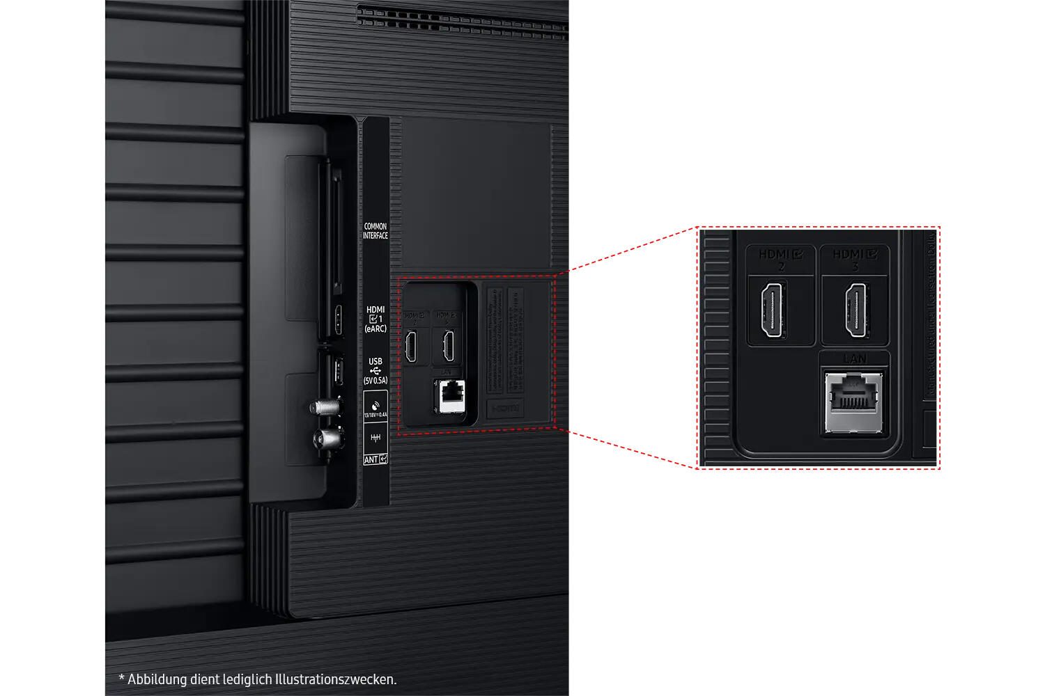 - Video-Anschlüsse: 3x HDMI (eARC), USB, DVB-T2, DVB-C, DVB-S2, CI+ Slot, LAN