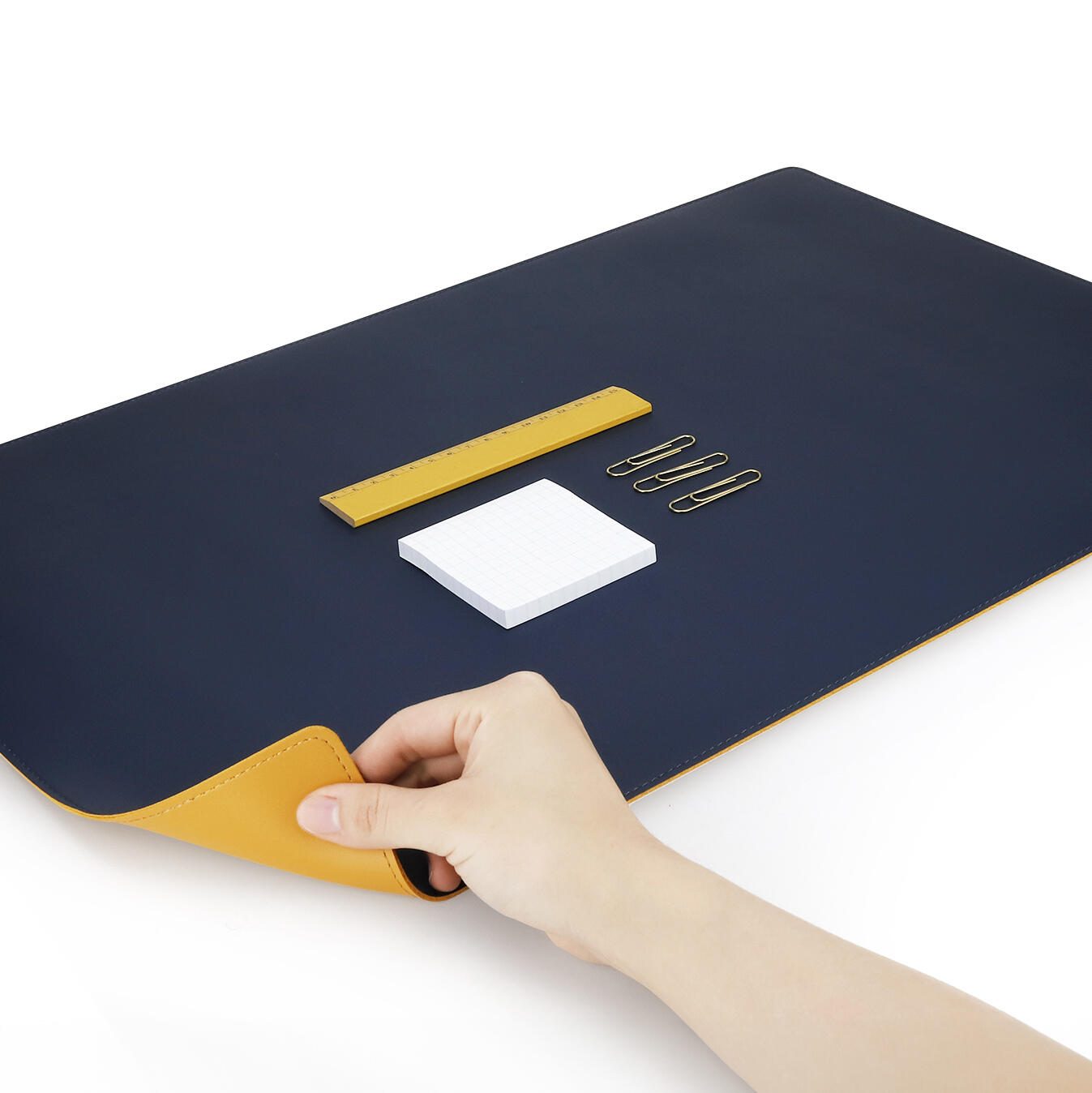 Die sax design Schreibtischunterlage in den Maßen 90,0 x 45,0 cm verbindet Funktionalität mit ansprechendem Design in den Farbtönen blau und gelb. Gefertigt aus hochwertigem Kunstleder bietet sie eine robuste und pflegeleichte Oberfläche, die abwaschbar, wasserdicht und rutschfest ist. Dadurch schützt sie Ihren Schreibtisch zuverlässig vor Kratzern, Flecken und Feuchtigkeit und sorgt gleichzeitig für einen sicheren Stand Ihrer Arbeitsutensilien.