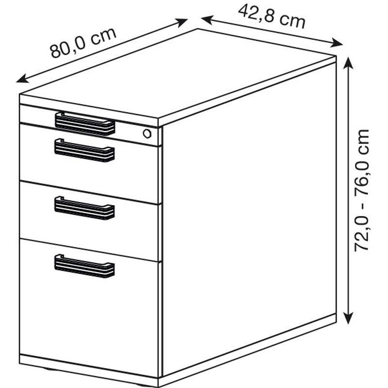 Der HAMMERBACHER Haziender Standcontainer in der eleganten Buche-Optik vereint Funktionalität und ansprechendes Design. Mit seinen kompakten Maßen von 42,8 x 80,0 x 72,0 - 76,0 cm passt er ideal in jedes Büro oder Arbeitszimmer und bietet gleichzeitig ausreichend Stauraum für Unterlagen und Büromaterialien. Die Konstruktion aus hochwertiger Spanplatte sorgt für Stabilität und Langlebigkeit, während die ansprechende Buche-Farbe eine warme und einladende Atmosphäre schafft. Besonders hervorzuheben ist die innovative Ausführung mit Selbsteinzug und Soft-Stopp, die ein sanftes und geräuschloses Schließen der Schubladen ermöglicht. Dies trägt nicht nur zur Langlebigkeit des Möbelstücks bei, sondern sorgt auch für ein angenehmes Nutzungserlebnis. Der Standcontainer verfügt über vier großzügige Auszüge, die durch den praktischen Relinggriff leicht zu bedienen sind. Diese Griffausführung aus Kunststoff ist nicht nur ergonomisch, sondern fügt sich auch harmonisch in das Gesamtbild des Containers ein. Mit zwei Fächern bietet der Standcontainer ausreichend Platz für all deine wichtigen Dokumente und Utensilien, sodass du stets einen aufgeräumten Arbeitsplatz genießen kannst. Die zeitlose Gestaltung und die hochwertige Verarbeitung machen den HAMMERBACHER Haziender Standcontainer zu einer wertvollen Ergänzung für dein Zuhause oder Büro. Durch die Kombination aus Funktionalität und ansprechendem Design ist er die perfekte Lösung für alle, die Wert auf Ordnung und Stil legen.Technische Daten