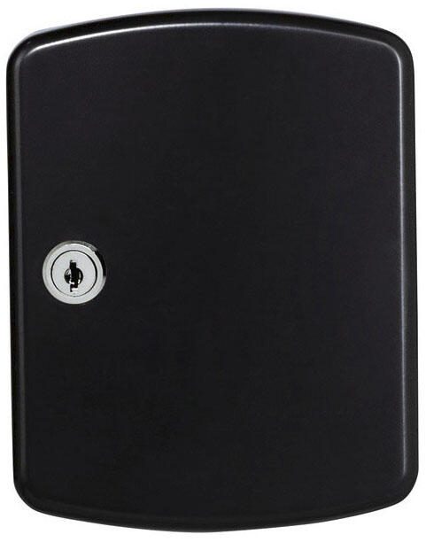 Die schwarze Farbgebung verleiht dem Schlüsselkasten ein zeitloses und elegantes Erscheinungsbild, das in jedem Raum gut zur Geltung kommt. Die Halterung mit Bohrungen in der Rückwand ermöglicht eine einfache und sichere Montage an der gewünschten Stelle, während der rechtsanschlagende Türmechanismus die Handhabung erleichtert.