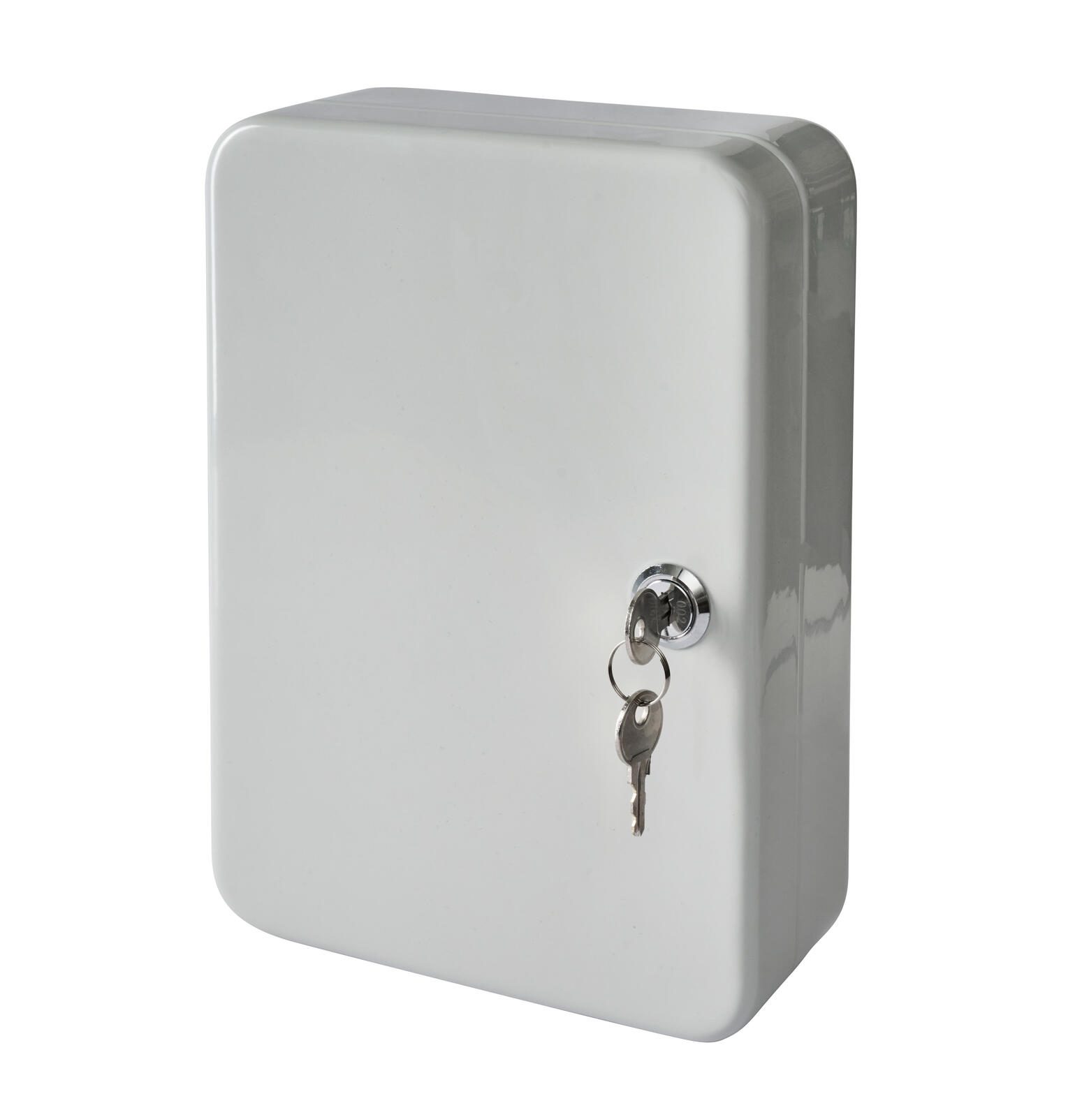 Dank der praktischen Bohrungen in der Rückwand lässt sich die Schlüsselkassette lg 20 Schlü. mühelos an der gewünschten Stelle befestigen. Die Tür des Schlüsselkastens mit 20 Zylinderschloss in lichtgrau schlägt nach rechts auf, was eine einfache Handhabung ermöglicht.