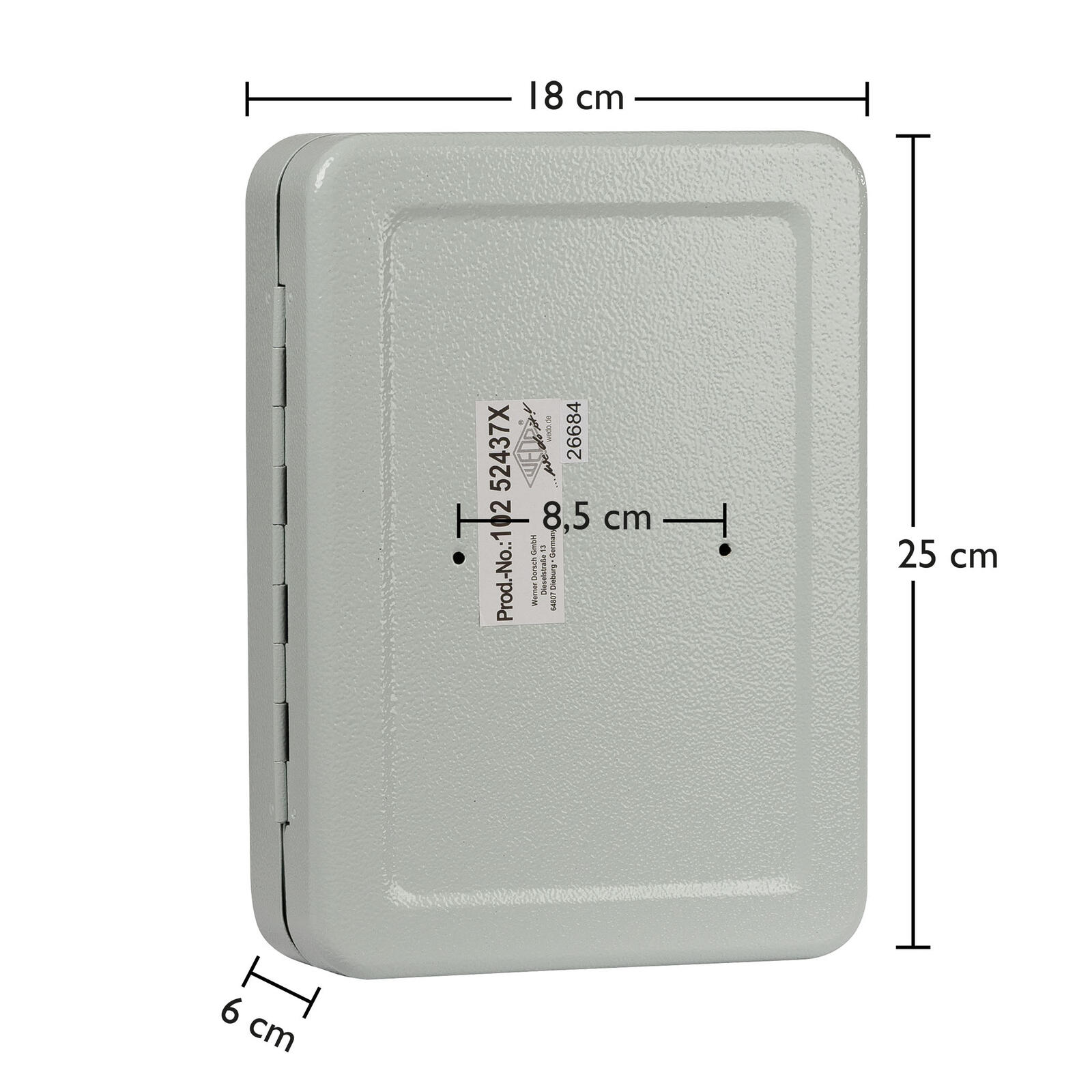 Dank seiner kompakten Maße von 18,0 x 6,0 x 25,0 cm passt der Schlüsselkasten problemlos an jede Wand. Mit einem Gewicht von 0,95 Kilogramm und der leichten Montage durch die 2 Bohrungen in der Rückwand ist die Installation mühelos. Die lichtgraue Farbe verleiht dem Schlüsselkasten zudem ein modernes und unauffälliges Aussehen.