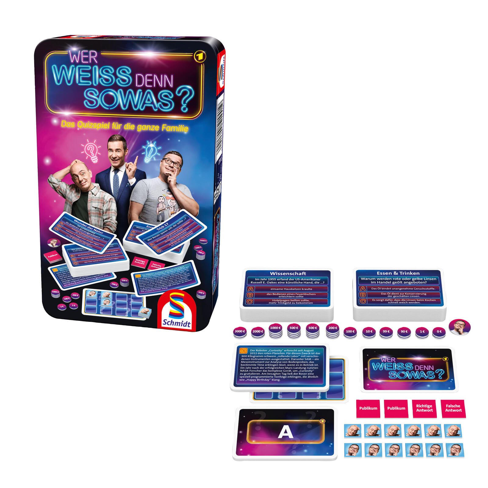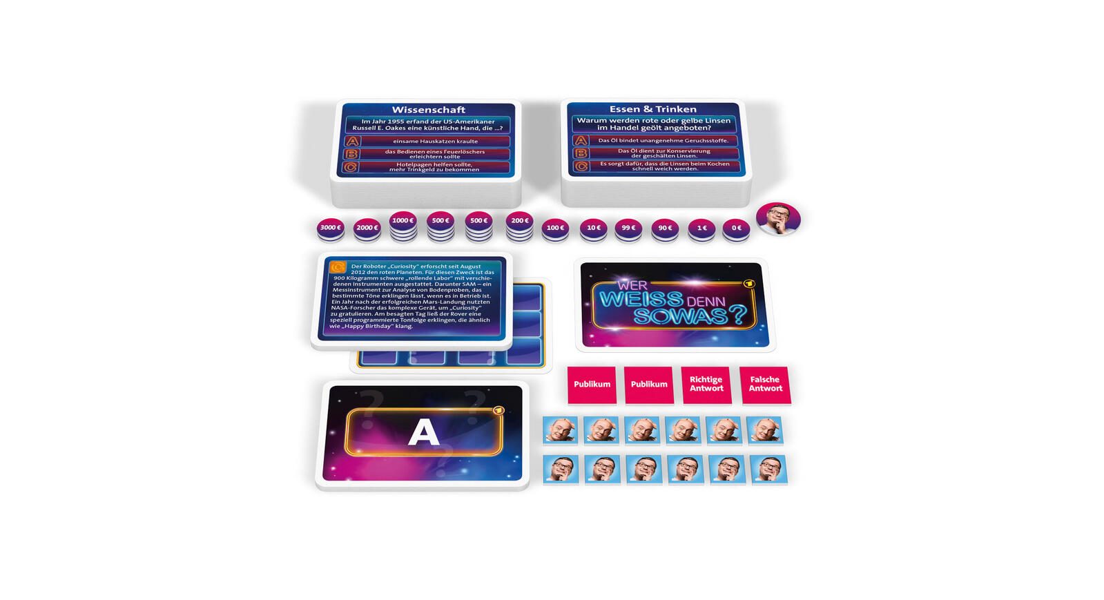 - Lieferung inkl.: 102 Quizkarten, 32 Geldplättchen, 6 ABC-Karten, 4 Publikumskarten, Ratewandkarte, Stapelkarte, Wurfplättchen, Spielanleitung