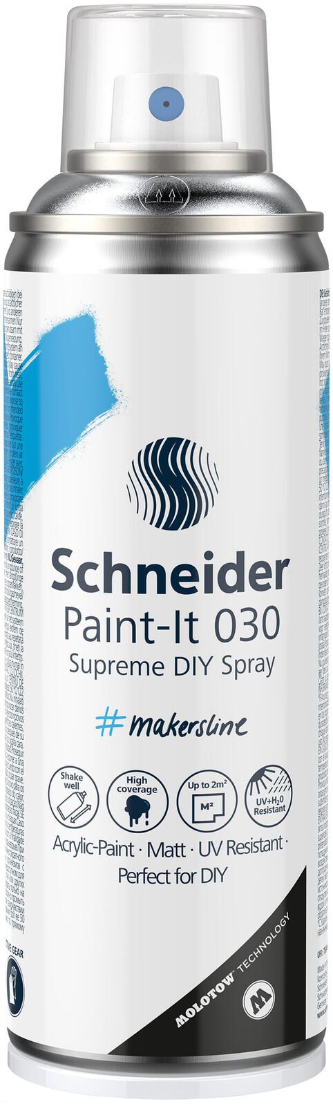 Das Schneider Supreme Paint-It 030 Acrylspray in der Farbe silver metallic ist ein vielseitiger Farbspray, der sich für fast alle Materialien eignet. Mit einem Inhalt von 200 ml bietet es ausreichend Farbe für verschiedene Projekte im Heim- und Bastelbereich. Das Spray gehört zur Produktserie Paint-It 030 Supreme DIY und ist Teil der Bastelfarben-Familie von Schneider.