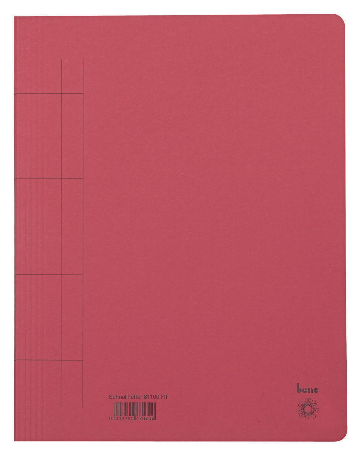 Der bene Schnellhefter DIN A4 in einem ansprechenden Rot ist die ideale Lösung für die Organisation deiner Unterlagen. Mit einem Fassungsvermögen von ca. 250 Blatt bietet dieser Schnellhefter ausreichend Platz für deine wichtigsten Dokumente und sorgt dafür, dass alles sicher und ordentlich verstaut ist. Die kaufmännische Heftung garantiert eine zuverlässige und einfache Handhabung, sodass du schnell auf die benötigten Unterlagen zugreifen kannst. Der aus hochwertigem Karton gefertigte Schnellhefter ist nicht nur robust, sondern auch umweltfreundlich, da er aus recyceltem Material besteht. Die leuchtende rote Farbe verleiht deinem Büro oder Arbeitsplatz eine frische Note und sorgt dafür, dass du deine Dokumente schnell wiederfindest. Der bene Schnellhefter ist speziell für das Format DIN A4 konzipiert und eignet sich perfekt für die Ablage von Berichten, Präsentationen oder anderen wichtigen Unterlagen. Mit einer Packung von 25 Stück bist du bestens ausgestattet, um deine Dokumente effizient zu organisieren. Ob im Büro, in der Schule oder zu Hause, dieser Schnellhefter ist ein unverzichtbares Hilfsmittel für jeden, der Wert auf Ordnung und Übersichtlichkeit legt. Die Kombination aus Funktionalität und ansprechendem Design macht den bene Schnellhefter zu einer ausgezeichneten Wahl für alle, die ihre Unterlagen stilvoll und praktisch aufbewahren möchten.Technische Daten