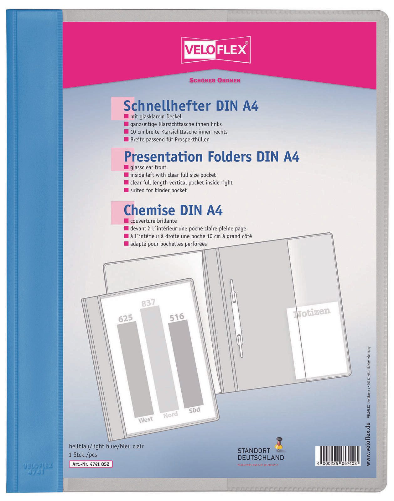 Der VELOFLEX Schnellhefter DIN A4 überbreit in einem ansprechenden hellblau ist die perfekte Lösung für alle, die ihre Dokumente stilvoll und sicher aufbewahren möchten. Hergestellt aus hochwertigem PVC, bietet dieser Schnellhefter nicht nur eine ansprechende Optik, sondern auch eine hohe Langlebigkeit. Mit einem Fassungsvermögen von ca. 100 Blatt ist er ideal für die Organisation von umfangreichen Unterlagen, sei es im Büro, in der Schule oder zu Hause. Die kaufmännische Heftung sorgt dafür, dass deine Dokumente fest und ordentlich gehalten werden. Egal, ob du wichtige Berichte, Präsentationen oder persönliche Unterlagen ablegen möchtest, der VELOFLEX Schnellhefter gewährleistet, dass alles an seinem Platz bleibt. Die transparente Vorderseite ermöglicht es dir, den Inhalt auf einen Blick zu erkennen, ohne den Schnellhefter öffnen zu müssen. Mit seiner überbreiten Ausführung ist dieser Schnellhefter speziell für Formate von DIN A4 konzipiert, was ihn besonders vielseitig macht. Der hellblaue Farbton verleiht deinem Arbeitsplatz eine frische und moderne Note und sorgt dafür, dass deine Unterlagen nicht nur gut organisiert, sondern auch ansprechend präsentiert werden. Die Verwendung von PVC als Material sorgt zudem dafür, dass der Schnellhefter robust und widerstandsfähig ist. Du kannst dich darauf verlassen, dass deine Dokumente optimal geschützt sind, egal wo du sie aufbewahrst oder transportierst. Der VELOFLEX Schnellhefter ist nicht nur funktional, sondern auch ein stilvolles Accessoire für jeden, der Wert auf eine gute Präsentation seiner Unterlagen legt.Technische Daten
