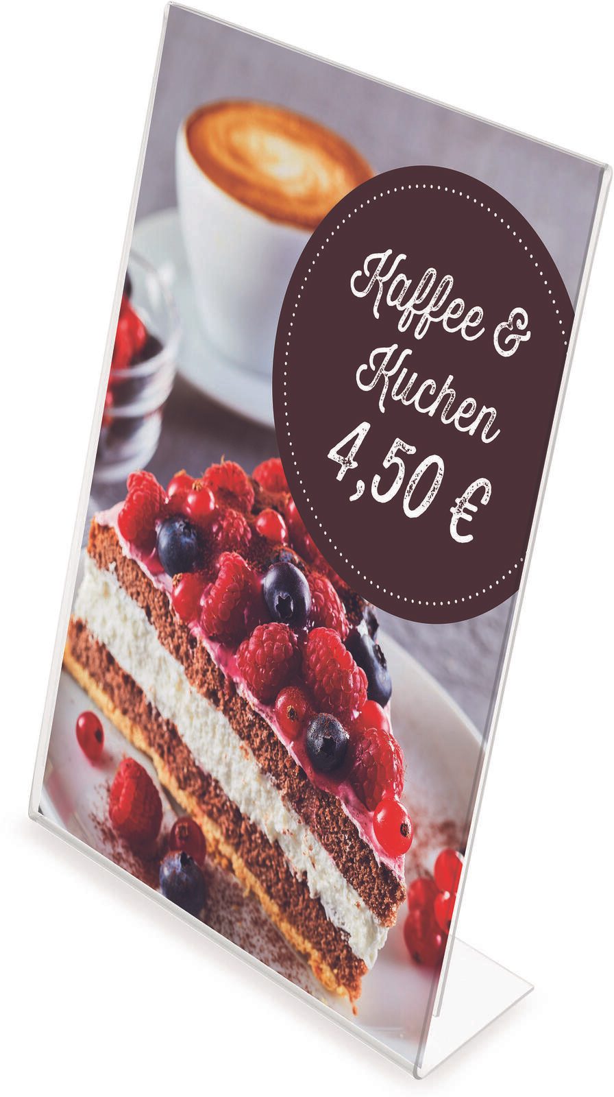 Der deflecto Tischaufsteller ist stabil konstruiert und bietet eine zuverlässige Möglichkeit, spezielle Angebote, Speisekarten, Werbematerialien oder Hinweise auf elegante Weise zu präsentieren. Dank seiner schrägen Form hebt er sich von herkömmlichen Werbedisplays ab und zieht die Blicke deiner Kunden oder Gäste magisch an.