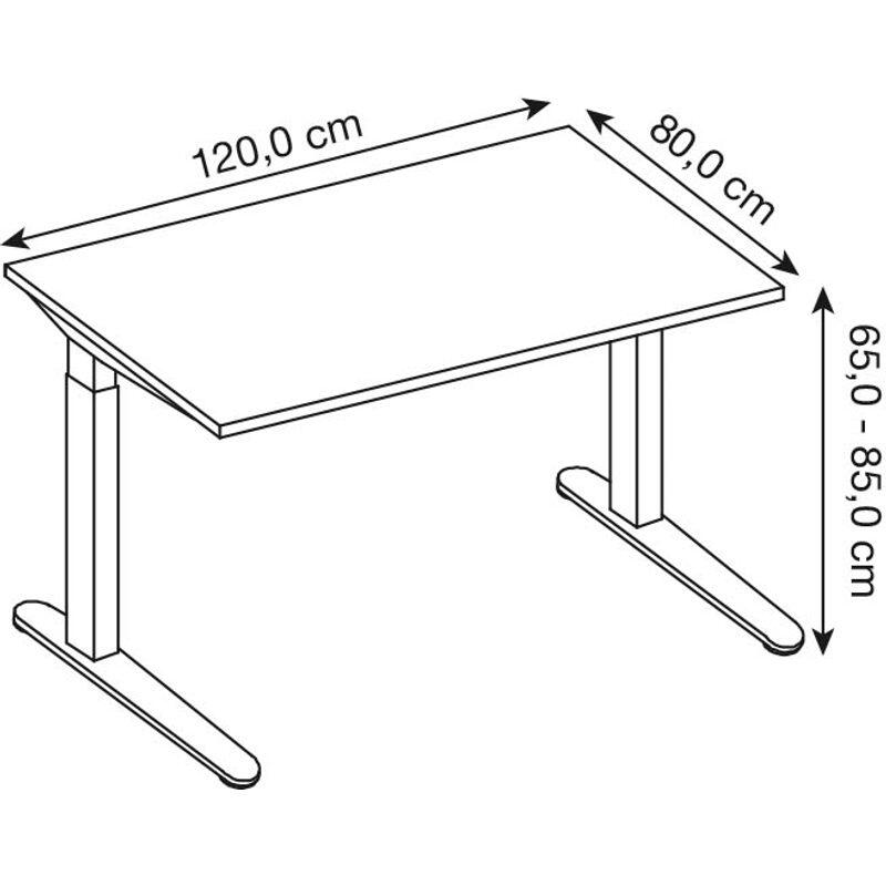 Der HAMMERBACHER höhenverstellbare Schreibtisch VXB12/6/SS vereint Funktionalität und modernes Design in einem ansprechenden Möbelstück. Die Tischplatte aus hochwertiger Spanplatte in Buche-Optik sorgt für eine warme und einladende Atmosphäre in Ihrem Arbeitsbereich. Das stabile C-Fuß-Gestell aus robustem Stahl in Silber bietet nicht nur eine hohe Stabilität, sondern verleiht dem Schreibtisch auch eine elegante Note. Mit den Maßen von 120 cm in der Breite, 80 cm in der Tiefe und einer Höhe von 65 cm ist dieser Schreibtisch ideal für verschiedene Anwendungen, sei es im Homeoffice, im Büro oder als Arbeitsplatz für kreative Tätigkeiten. Die Höhenverstellbarkeit ermöglicht es Ihnen, die Tischhöhe individuell anzupassen, um ergonomisch korrekt arbeiten zu können. Dies trägt zu einer verbesserten Körperhaltung und damit zu einem angenehmeren Arbeitserlebnis bei. Ob Sie an einem Projekt arbeiten, telefonieren oder einfach nur Ihre Gedanken sortieren möchten, der HAMMERBACHER Schreibtisch bietet Ihnen ausreichend Platz und Komfort. Die klare Linienführung und die schlichte Farbgestaltung machen ihn zu einem zeitlosen Möbelstück, das sich harmonisch in jede Umgebung einfügt. Durch die Verwendung von strapazierfähigen Materialien ist der Schreibtisch nicht nur langlebig, sondern auch pflegeleicht. Die Kombination aus Funktionalität und Ästhetik macht den HAMMERBACHER höhenverstellbaren Schreibtisch VXB12/6/SS zu einer hervorragenden Wahl für jeden, der Wert auf Qualität und Design legt.Technische Daten
