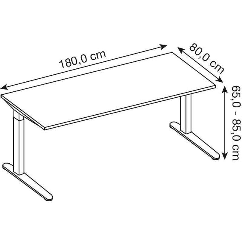 Der HAMMERBACHER höhenverstellbare Schreibtisch VXB19/6/SS vereint Funktionalität und modernes Design in einem ansprechenden Möbelstück. Mit einer großzügigen Tischplatte aus Spanplatte in edler Buche-Optik bietet dieser Schreibtisch nicht nur ausreichend Platz für Ihre Unterlagen und Geräte, sondern auch eine angenehme Arbeitsatmosphäre. Das silberne C-Fuß-Gestell aus robustem Stahl sorgt für Stabilität und Langlebigkeit, während die Höhenverstellbarkeit eine individuelle Anpassung an Ihre Bedürfnisse ermöglicht. Die Maße von 180 cm in der Breite, 80 cm in der Tiefe und 65 cm in der Höhe machen diesen Schreibtisch ideal für verschiedene Arbeitsumgebungen, sei es im Homeoffice oder im Büro. Durch die Möglichkeit, die Höhe anzupassen, können Sie sowohl im Sitzen als auch im Stehen arbeiten, was zu einer besseren Körperhaltung und mehr Komfort während langer Arbeitsstunden beiträgt. Die Kombination aus der hellen Buche-Farbe und dem silbernen Gestell verleiht dem Schreibtisch eine moderne und ansprechende Optik, die sich harmonisch in jedes Raumkonzept einfügt. Zudem ist der Schreibtisch frei von Schubladen oder Fächern, was Ihnen die Flexibilität gibt, Ihre Arbeitsfläche ganz nach Ihren Wünschen zu gestalten. Der HAMMERBACHER Schreibtisch ist nicht nur ein praktisches Möbelstück, sondern auch ein stilvolles Element, das Ihre Kreativität und Produktivität fördert. Mit seiner soliden Bauweise und anpassbaren Höhe ist er die perfekte Wahl für alle, die Wert auf Ergonomie und Design legen.Technische Daten