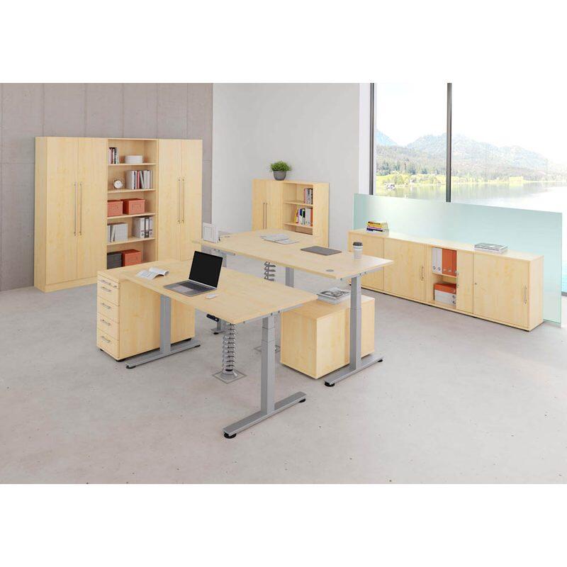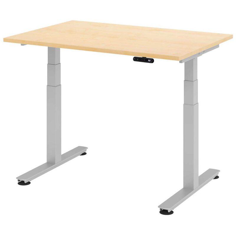 Der HAMMERBACHER elektrisch höhenverstellbare Schreibtisch VXDSM12/3/S in elegantem Ahorn-Design bietet Ihnen die Möglichkeit, Ihre Arbeitsumgebung individuell zu gestalten und ergonomisch zu optimieren. Mit einem stabilen T-Fuß-Gestell aus hochwertigem Stahl und einer robusten Tischplatte aus Spanplatte ist dieser Schreibtisch sowohl funktional als auch stilvoll. Die silberne Rahmenfarbe verleiht ihm eine moderne Note und fügt sich harmonisch in jedes Büroambiente ein.