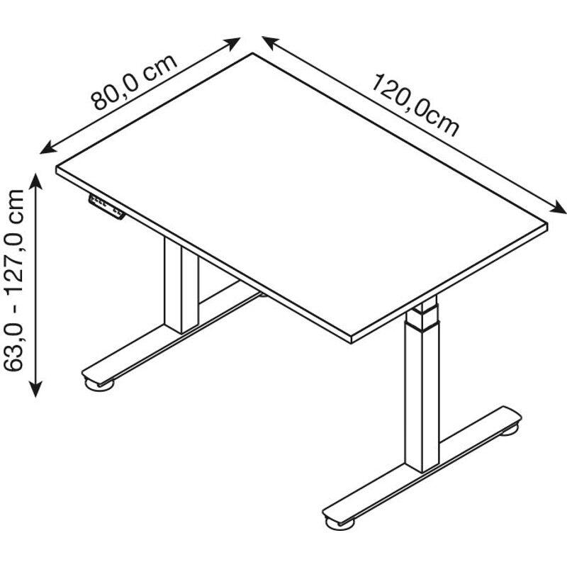Die großzügigen Maße von 120 cm in der Breite, 80 cm in der Tiefe und einer variablen Höhe von 63 cm ermöglichen es Ihnen, bequem im Sitzen oder Stehen zu arbeiten. Dank der elektrischen Höhenverstellung können Sie die Tischhöhe mühelos an Ihre Bedürfnisse anpassen, was nicht nur den Komfort erhöht, sondern auch Ihre Gesundheit unterstützt, indem es die Möglichkeit bietet, den Arbeitstag aktiv zu gestalten.
