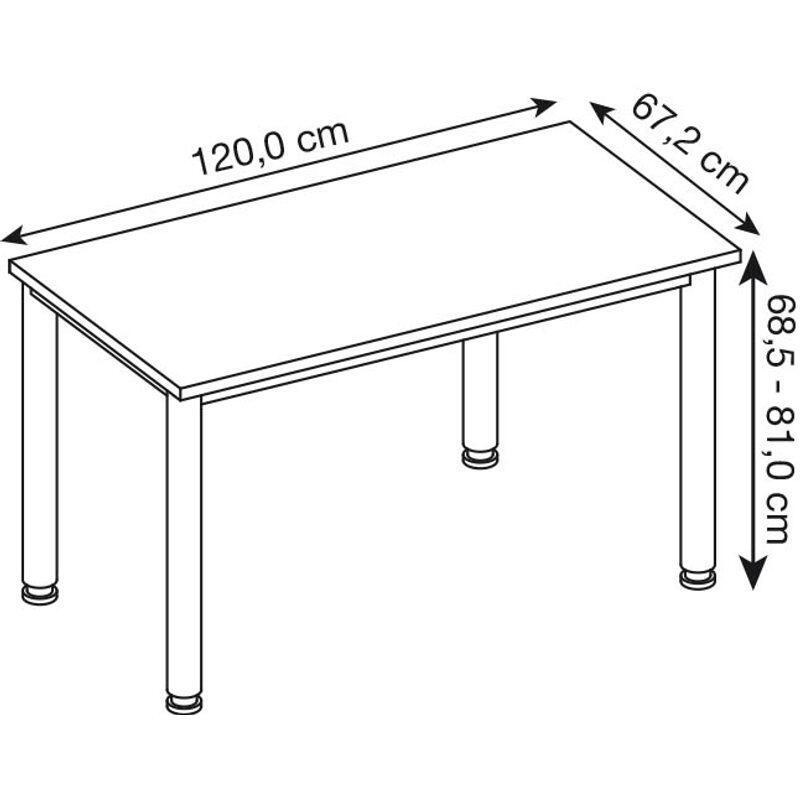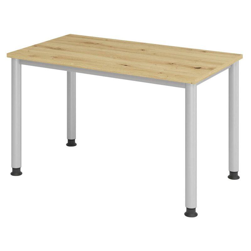 Der HAMMERBACHER Schreibtisch VHS612/R/S in Asteiche bietet Ihnen eine ideale Kombination aus Funktionalität und ansprechendem Design. Die Tischplatte besteht aus robuster Spanplatte, die nicht nur langlebig ist, sondern auch eine ansprechende Holzoptik in Asteiche bietet. Diese natürliche Farbgebung verleiht Ihrem Arbeitsbereich eine warme und einladende Atmosphäre. Das Gestell des Schreibtisches ist aus hochwertigem Stahl gefertigt und in einem eleganten Silberton gehalten. Diese Kombination sorgt für eine hohe Stabilität und Langlebigkeit des Möbels. Mit einem 4-Fuß-Gestell bietet der Schreibtisch eine ausgezeichnete Standfestigkeit, die Ihnen ein sicheres und komfortables Arbeiten ermöglicht. Mit den Maßen von 120 cm in der Breite, 67.2 cm in der Tiefe und 68.5 cm in der Höhe ist der Schreibtisch optimal dimensioniert, um sowohl in kleinen als auch in größeren Räumen Platz zu finden. Die klare Linienführung und das zeitlose Design machen den HAMMERBACHER Schreibtisch zu einem vielseitigen Möbelstück, das sich harmonisch in verschiedene Einrichtungsstile integrieren lässt. Zusätzlich bietet der Schreibtisch keine Fächer oder Schübe, was Ihnen einen großzügigen und ungestörten Arbeitsplatz schafft. Dies ermöglicht Ihnen, Ihre Arbeitsmaterialien übersichtlich zu platzieren und sorgt für eine aufgeräumte Optik. Der HAMMERBACHER Schreibtisch HS612 in Asteiche ist die perfekte Wahl für alle, die Wert auf Qualität, Funktionalität und ein ansprechendes Design legen. Er ist nicht nur ein funktionales Möbelstück, sondern auch ein Blickfang in jedem Arbeitszimmer.Technische Daten