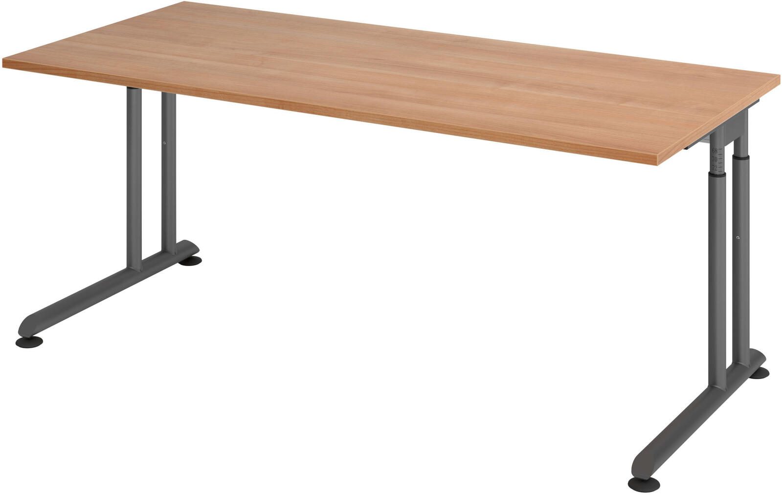 Der HAMMERBACHER höhenverstellbare Schreibtisch VZS19/N/G in elegantem Nussbaum ist die ideale Lösung für modernes Arbeiten. Mit einer großzügigen Tischplatte aus Spanplatte, die optimalen Platz für Ihre Arbeitsmaterialien bietet, vereint dieser Schreibtisch Funktionalität und ansprechendes Design. Die Maße von 180 cm in der Breite, 80 cm in der Tiefe und 68 cm in der Höhe ermöglichen Ihnen eine komfortable Arbeitsumgebung, die sich leicht an Ihre individuellen Bedürfnisse anpassen lässt. Das robuste C-Fuß-Gestell aus Stahl sorgt für eine stabile Konstruktion und verleiht dem Tisch eine moderne Ästhetik. Der Farbton des Gestells in Grafit harmoniert perfekt mit der warmen Nussbaum-Oberfläche und schafft eine ansprechende Atmosphäre in jedem Büro oder Arbeitszimmer. Durch die Höhenverstellbarkeit können Sie den Tisch schnell und einfach auf die gewünschte Höhe anpassen, was nicht nur den Komfort erhöht, sondern auch Ihre Gesundheit unterstützt, indem Sie zwischen Sitzen und Stehen wechseln können. Dieser Schreibtisch ist nicht nur funktional, sondern auch ästhetisch ansprechend. Der Nussbaum-Farbton bringt Wärme und Eleganz in Ihre Arbeitsumgebung, während das klare Design und die hochwertigen Materialien eine langlebige Nutzung garantieren. Ohne zusätzliche Fächer oder Schübe konzentriert sich das Design auf das Wesentliche und schafft einen aufgeräumten Arbeitsplatz. Entscheiden Sie sich für den HAMMERBACHER höhenverstellbaren Schreibtisch VZS19/N/G und genießen Sie die Vorteile eines ergonomischen Arbeitsplatzes, der sowohl Stil als auch Funktionalität vereint.Technische Daten
