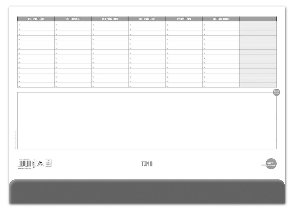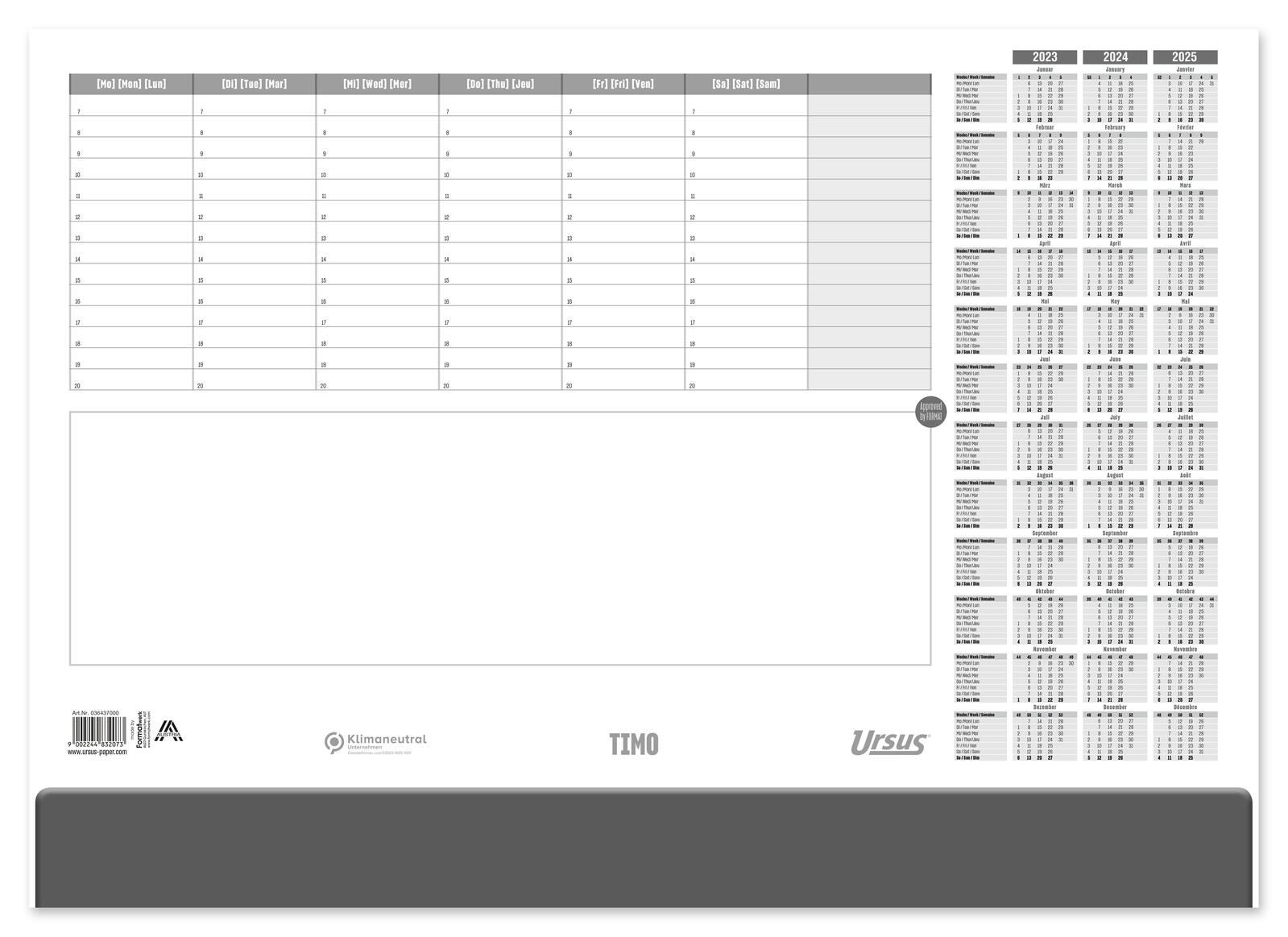 Die Ursus Schreibtischunterlage ist ein praktisches und stilvolles Accessoire für jeden Arbeitsplatz. Mit den Maßen von 52,5 x 37,5 cm bietet sie ausreichend Platz, um Notizen, Termine und kreative Ideen zu organisieren. Die Unterlage besteht aus hochwertigem Papier mit einem Gewicht von 80 g/m², was sie sowohl robust als auch angenehm in der Handhabung macht. Die schlichte weiße Farbe verleiht deinem Schreibtisch ein elegantes und aufgeräumtes Erscheinungsbild, während das integrierte Kalendermotiv dir hilft, den Überblick über wichtige Termine und Aufgaben zu behalten. Ob im Büro oder im Homeoffice, diese Schreibtischunterlage sorgt dafür, dass du stets gut organisiert bist und deine Gedanken strukturiert festhalten kannst. Die Ursus Schreibtischunterlage ist mit 50 Seiten ausgestattet, sodass du genügend Platz hast, um deine Ideen und Notizen festzuhalten. Die Unterseite aus Karton sorgt für Stabilität und verhindert ein Verrutschen während des Schreibens. Die praktische Schutzleiste bietet zusätzlichen Schutz und sorgt dafür, dass die Unterlage auch bei intensivem Gebrauch langlebig bleibt. Durch die Kombination aus Funktionalität und ansprechendem Design ist die Ursus Schreibtischunterlage nicht nur nützlich, sondern auch ein echter Blickfang auf deinem Schreibtisch. Sie ist die ideale Wahl für alle, die Wert auf Ordnung und Stil legen.Technische Daten