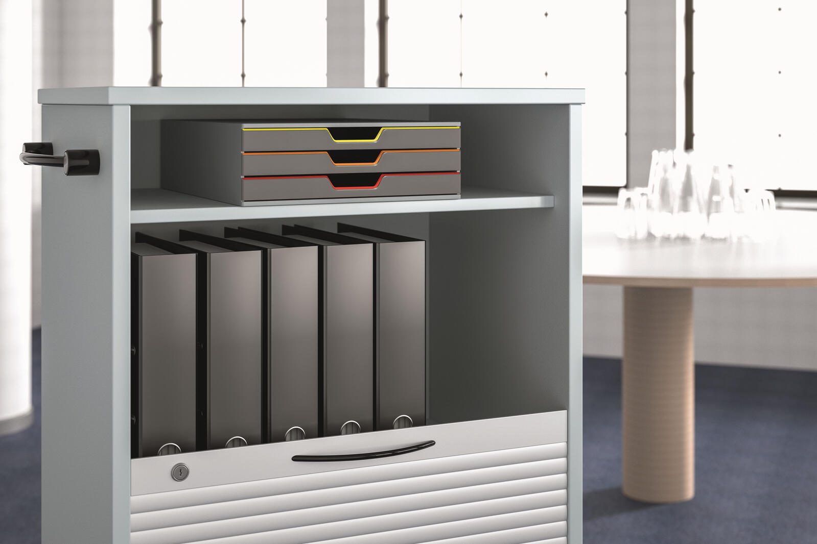Mit insgesamt drei Fächern bzw. Schüben bietet die VARICOLOR® Schubladenbox ausreichend Platz, um deine Unterlagen, Dokumente oder Schreibutensilien übersichtlich zu verstauen. Die Stapelfähigkeit ermöglicht es dir, mehrere Boxen platzsparend aufeinander zu stellen, was besonders praktisch ist, wenn du mehrere Boxen nutzt oder wenig Stellfläche hast.