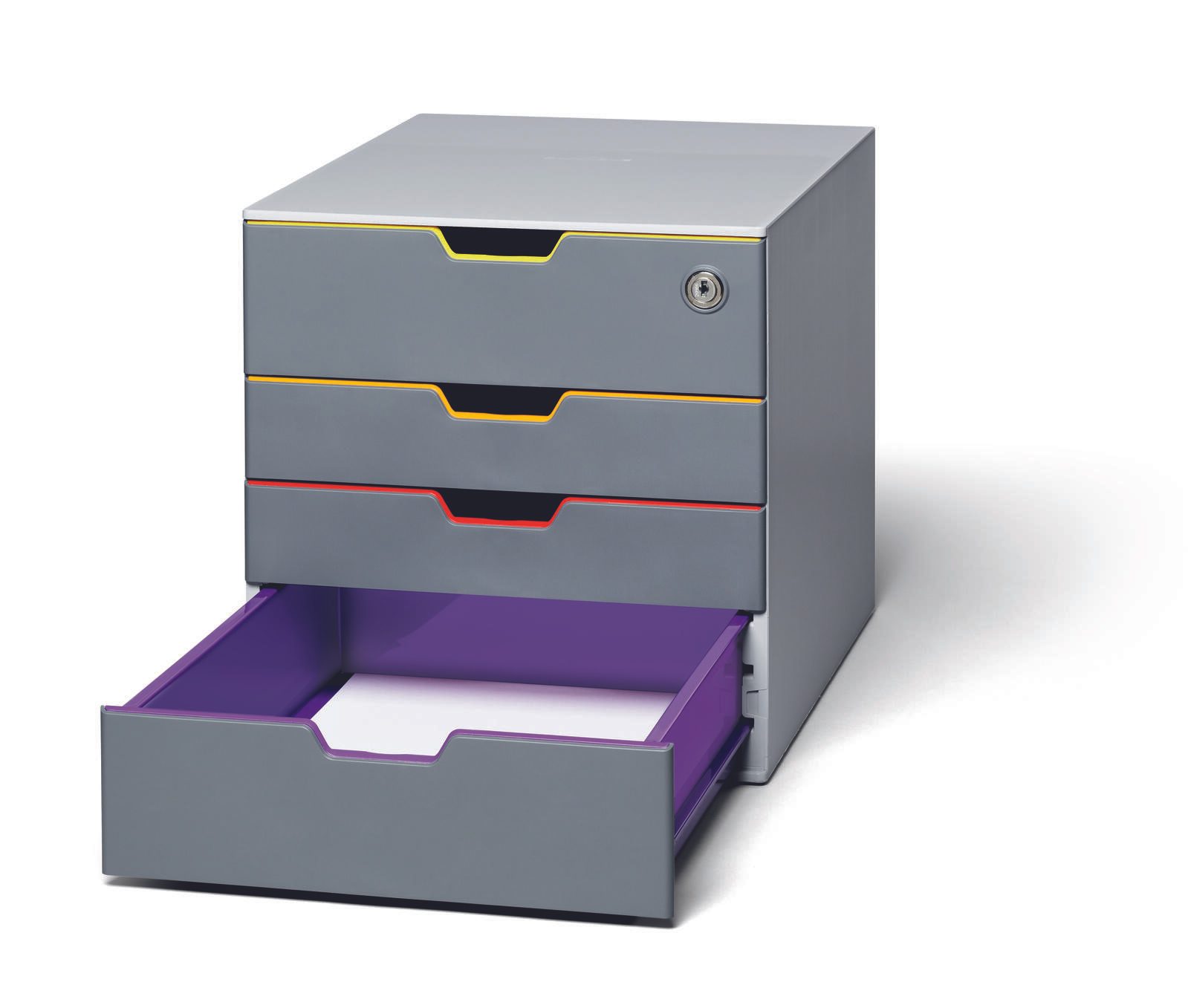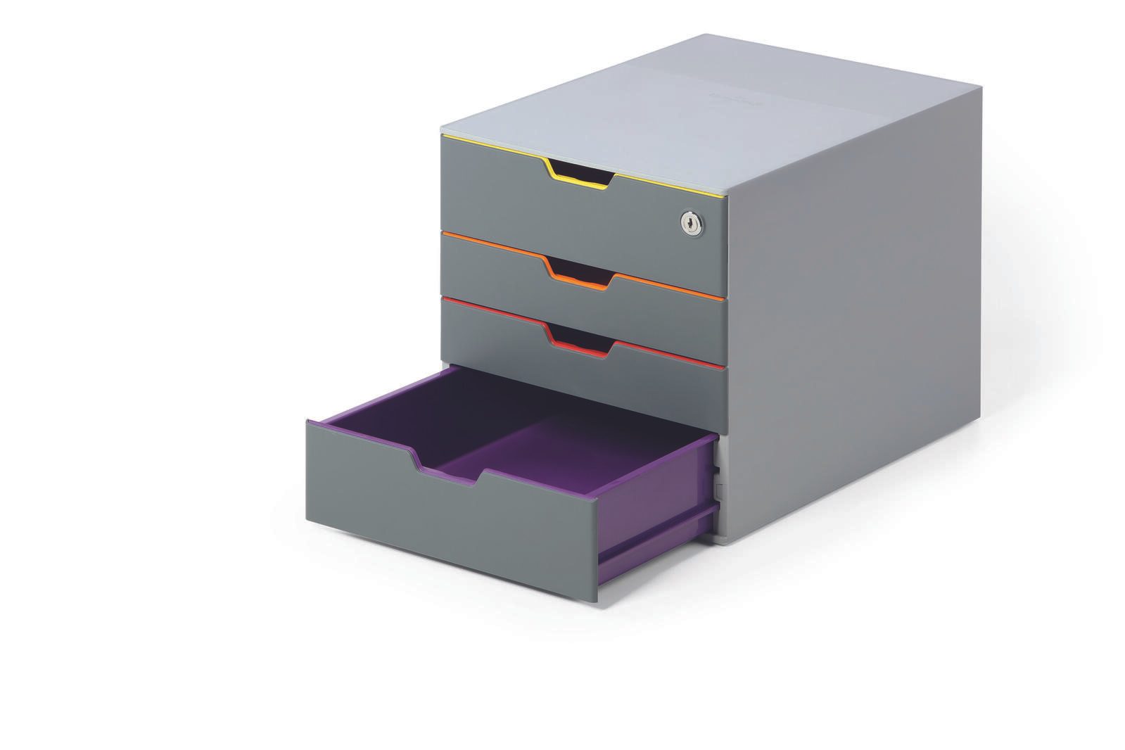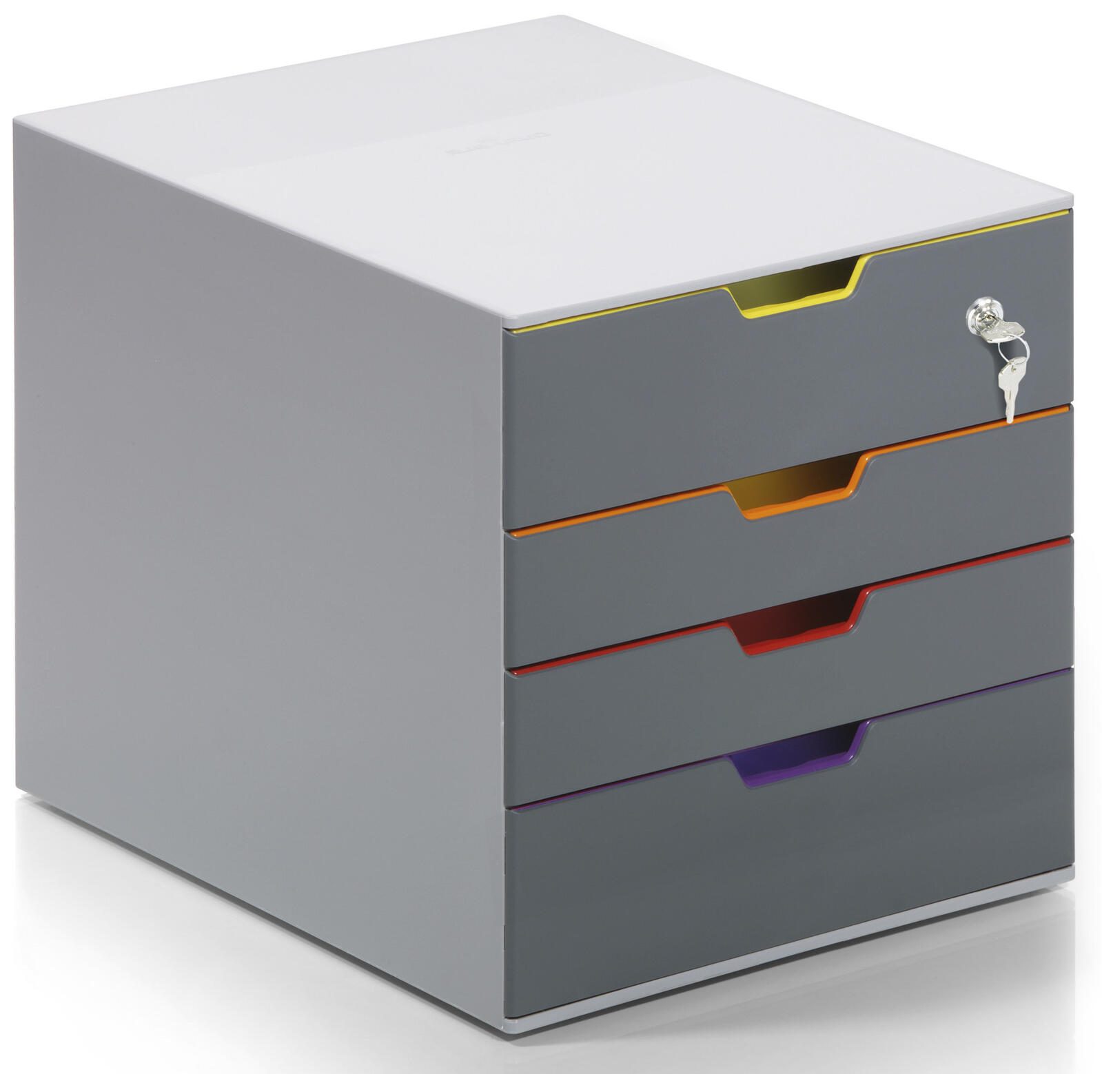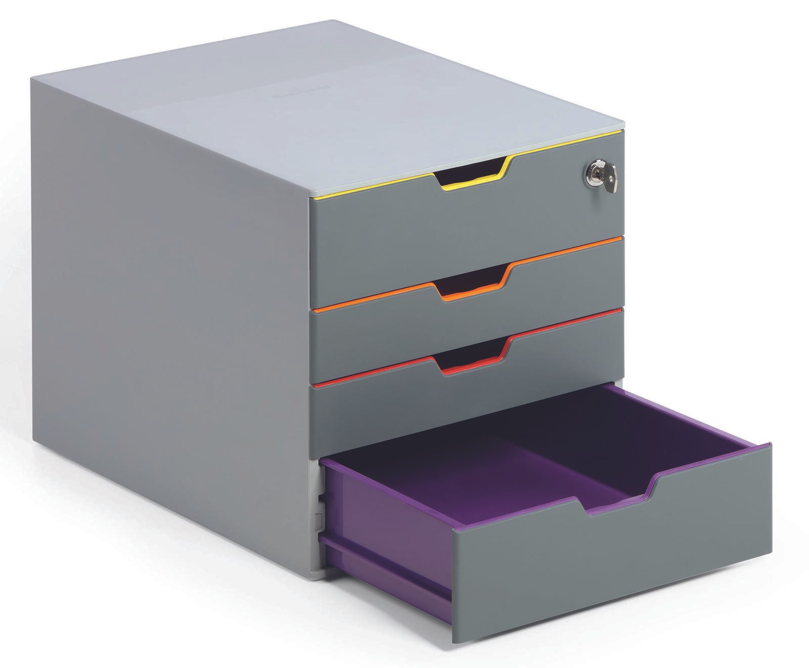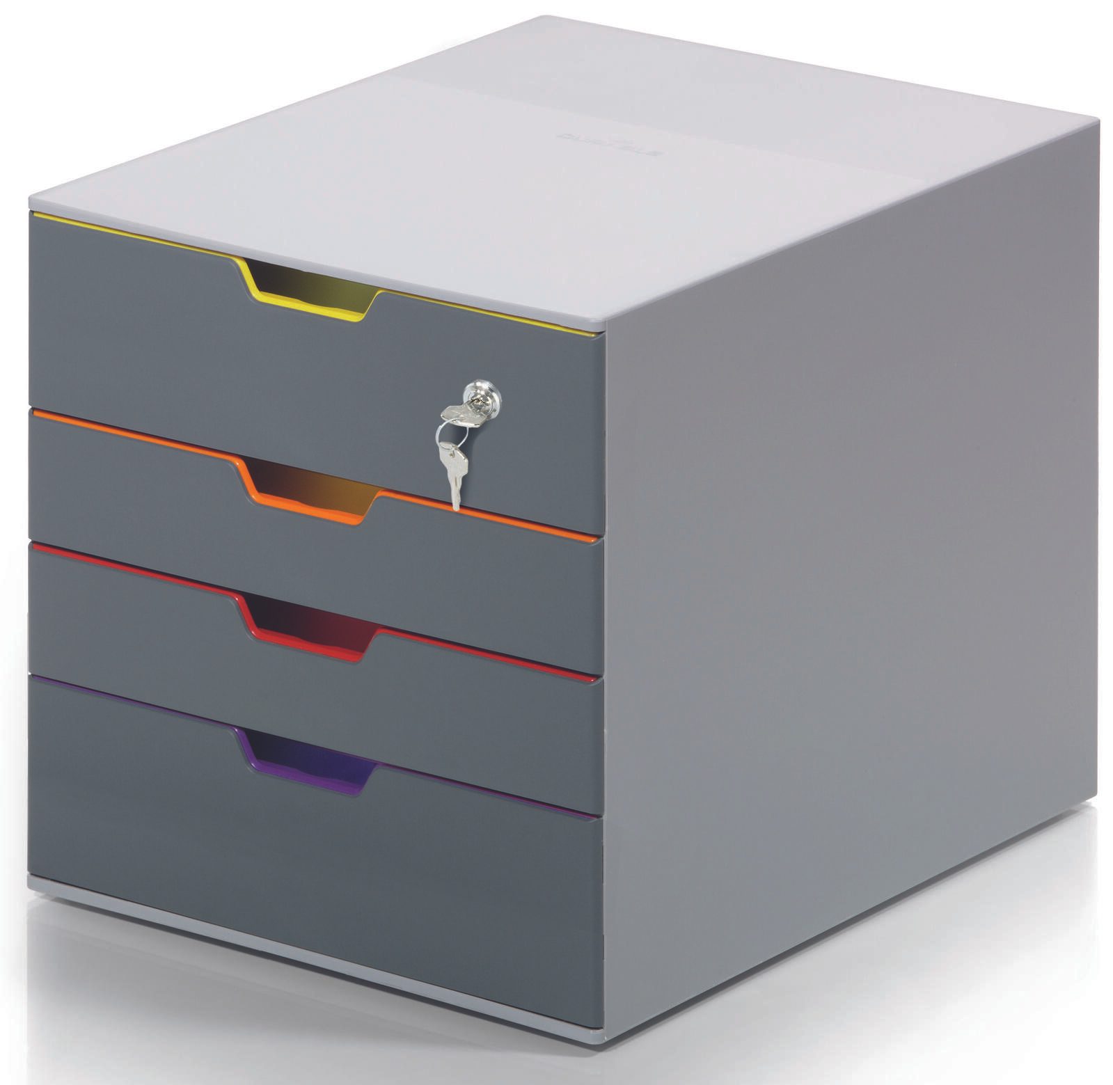 Die DURABLE Schubladenbox Varicolor Safe verfügt über insgesamt 4 geschlossene Schubladen, wovon die obere abschließbar ist. Dadurch kannst du deine Dokumente nicht nur übersichtlich sortieren, sondern auch vor unbefugtem Zugriff schützen. Die stapelbare Bauweise ermöglicht es dir, mehrere Boxen platzsparend zu verstauen und somit deine Arbeitsfläche effizient zu nutzen.