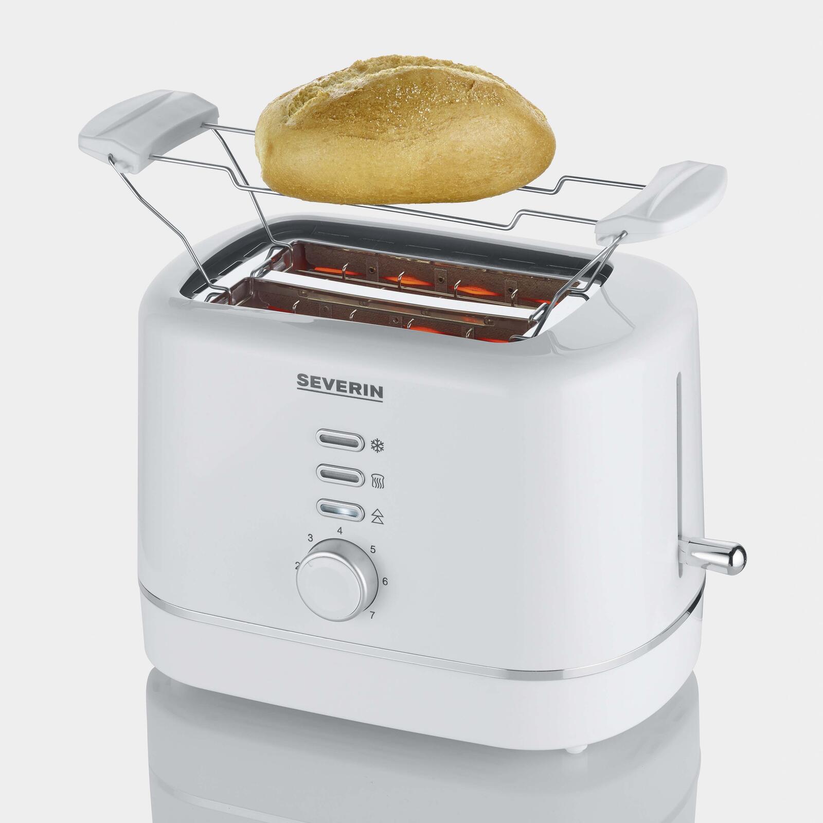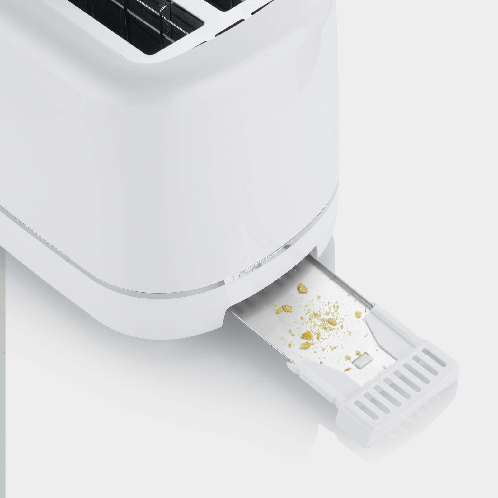 Zu den Ausstattungsmerkmalen gehören eine Stoppfunktion, mit der das Toasten jederzeit unterbrochen werden kann, sowie eine Auftaufunktion für gefrorene Brotscheiben. Zusätzlich ermöglicht die Aufwärmfunktion das Erwärmen bereits getoasteter Brote. Ein Brötchenaufsatz erweitert die Einsatzmöglichkeiten und eine herausnehmbare Krümelschublade erleichtert die Reinigung des Geräts.