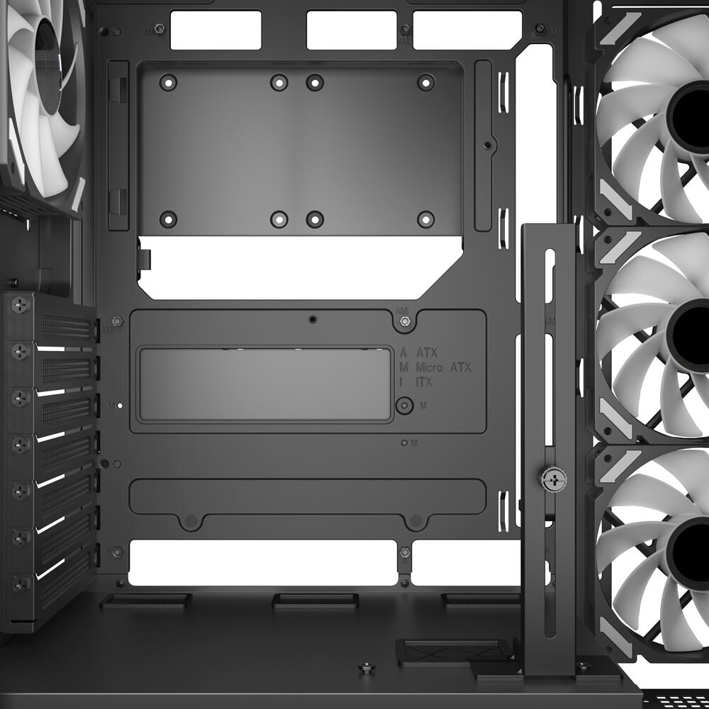 Dank eines seitlichen Lufteinzugs und gleich vier vorinstallierter 120-mm-ARGB-Lüfter ist trotz der großen Glasfläche eine starke Kühlleistung ab Werk möglich. Eine praktische ARGB-Steuerung sowie ein PWM-Lüfterhub mit fünf Plätzen gibt es dabei inklusive!