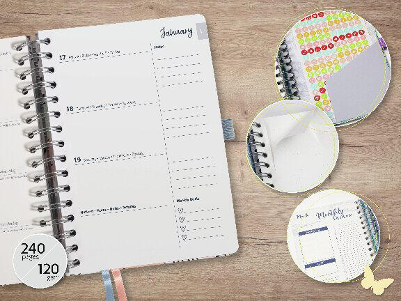 Das Cover des Kalenders besteht aus laminiertem Karton, der für eine robuste und widerstandsfähige Oberfläche sorgt. Der Kalender ist mit einer doppelten Spiralbindung an der Seite ausgestattet, die das Umblättern der Seiten erleichtert und eine flache Liegeposition ermöglicht. Für zusätzlichen Schutz und sicheren Verschluss sorgt ein Gummizug, der den Kalender zuverlässig zusammenhält.