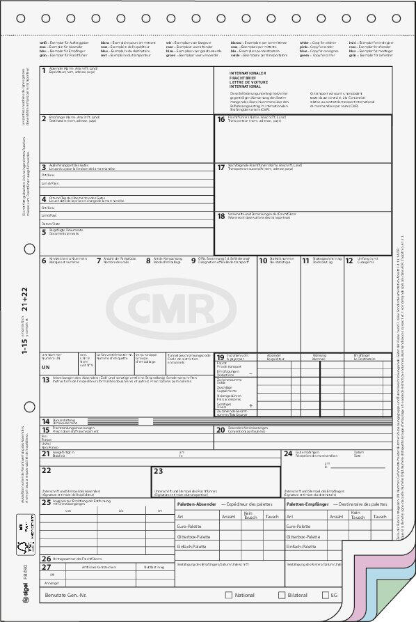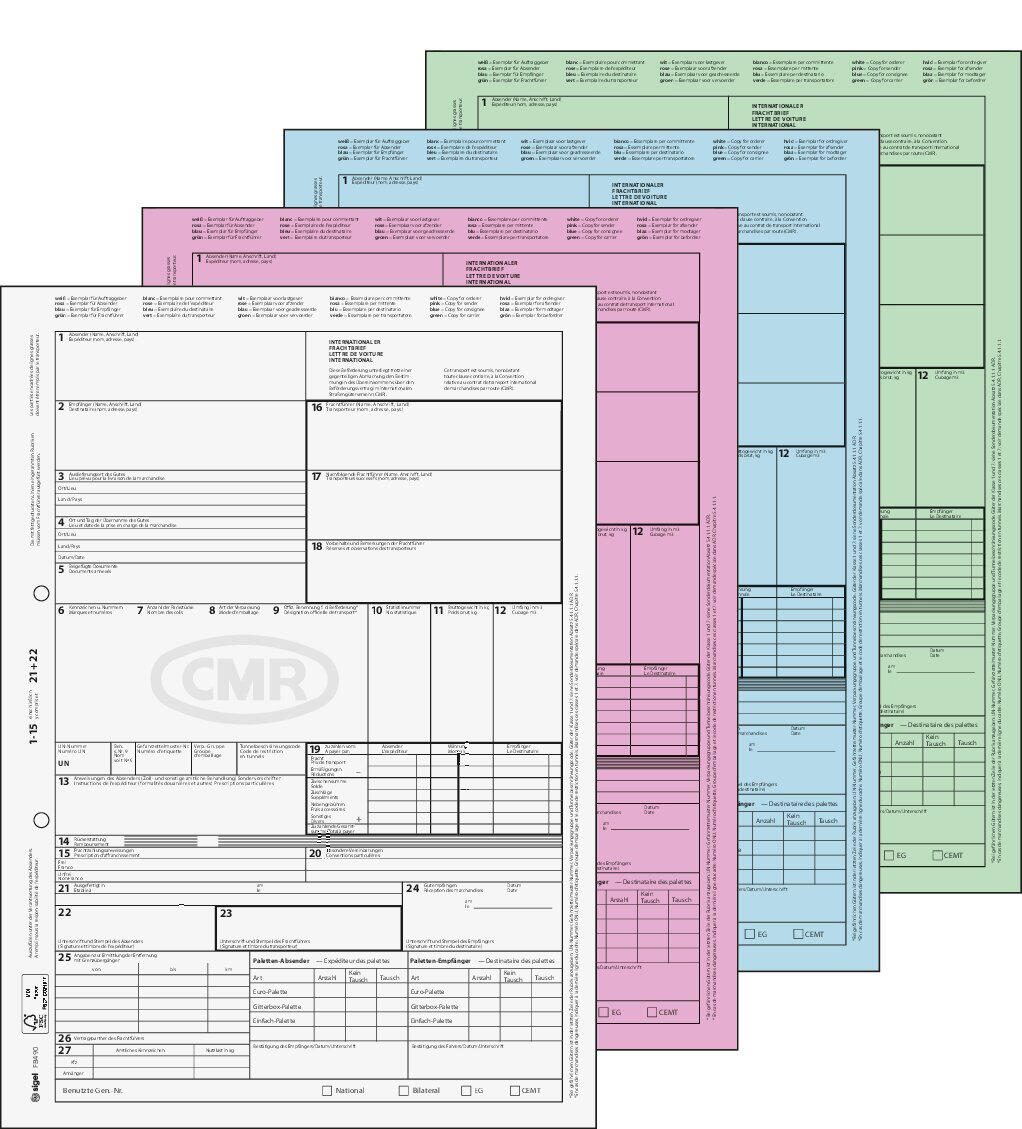 Die SIGEL Frachtbrief CMR-Frachtbriefe sind speziell für den internationalen Warenversand konzipiert. Dieses Produkt umfasst 50 Formulare im Format DIN A4, die jeweils aus 8 Seiten bestehen. Die Frachtbriefe sind selbstdurchschreibend (SD) und verfügen über eine 3-fache Durchschlagfunktion, sodass mehrere Kopien ohne zusätzlichen Aufwand erstellt werden können. Die Papierfarbe variiert dabei in den Farben Weiß, Rosa, Blau und Grün.
