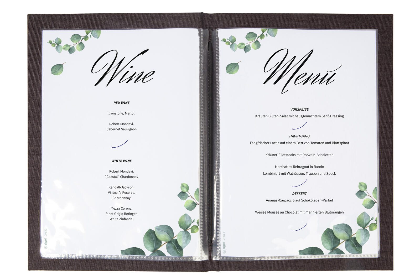 Die Öffnung der Sichthüllen befindet sich oben, was das Einlegen und Herausnehmen der Speisekarten erleichtert. Das Material besteht aus Polypropylen (PP), einem widerstandsfähigen Kunststoff, der für seine Langlebigkeit und Beständigkeit bekannt ist. Die glänzende Oberfläche verleiht den Hüllen eine hochwertige Optik und schützt die Dokumente gleichzeitig vor Feuchtigkeit und Abnutzung.