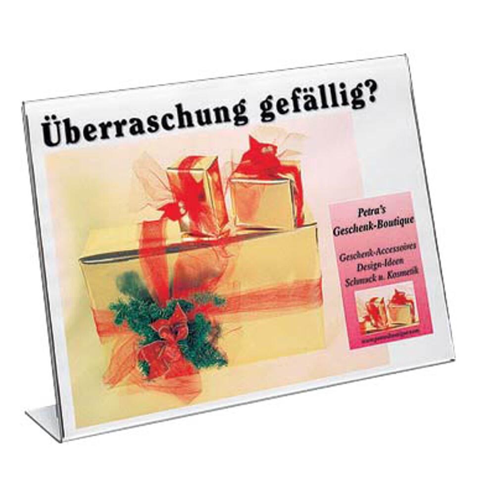 Schräger Tischaufsteller zur einseitigen Präsentation von beispielsweise Aktionen, Hinweisen oder Angeboten in der Größe DIN A4 quer. Für Theken, Tische, Ausstellungsräume und Messen. Hochwertiges, glasklares 1, 8 mm starkes Acryl mit polierten,
