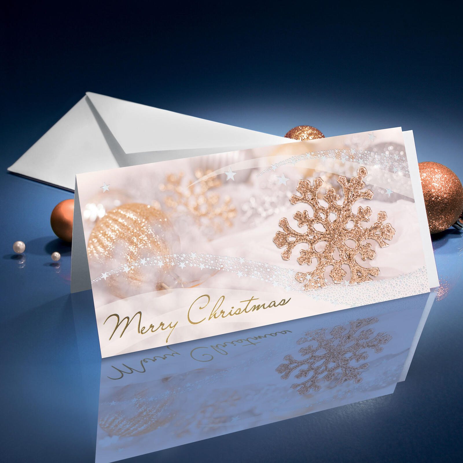 Die Karten sind aus glänzendem Karton gefertigt, der mit einem Papiergewicht von 220 g/m² eine stabile und edle Haptik vermittelt. Das verwendete Papier ist holzfrei und gebleicht, was für eine helle und saubere Oberfläche sorgt. Das Motiv ist farbig gestaltet und verleiht den Karten eine festliche Ausstrahlung.