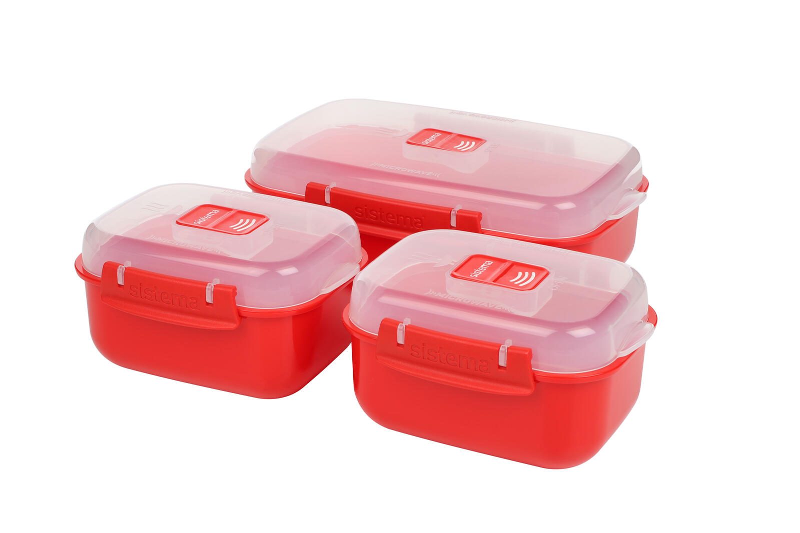 Das Sistema Mikrowellen-Set in Rot ist eine praktische und farbenfrohe Ergänzung für deine Küche. Hergestellt von sistema®, bietet dieses Set eine ideale Lösung für die Aufbewahrung und Erwärmung von Speisen in der Mikrowelle. Der Farbton Rot verleiht deiner Küche einen frischen Akzent und sorgt für gute Laune beim Zubereiten deiner Mahlzeiten. Die transparenten Behälter ermöglichen es dir, den Inhalt leicht zu erkennen, ohne den Deckel öffnen zu müssen. Das Set besteht aus insgesamt drei Behältern: zwei mit einem Fassungsvermögen von jeweils 525,0 ml und einen Behälter mit einem großzügigen Volumen von 1250,0 ml. Somit hast du die Möglichkeit, verschiedene Portionen passend zu deinem Bedarf vorzubereiten und aufzubewahren. Hergestellt aus hochwertigem Kunststoff, sind die Behälter langlebig und einfach zu reinigen. Sie sind so konzipiert, dass sie sicher in der Mikrowelle verwendet werden können, um Speisen schnell und bequem aufzuwärmen. Mit dem Sistema Mik.Geschirr 3er Set hast du die perfekte Lösung, um deine Mahlzeiten aufzubewahren und zu erwärmen, ohne dabei Kompromisse bei Qualität und Komfort eingehen zu müssen. Ein unverzichtbares Set für jeden Haushalt, das dir das Leben erleichtert und deine Küchenarbeit effizienter gestaltet.Technische Daten