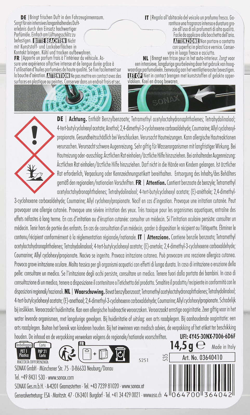 Der Autoduftspender gehört zur Produktserie „Ocean-fresh“ und wird von der SONAX GmbH hergestellt, einem deutschen Unternehmen mit Sitz in Neuburg an der Donau. Mit diesem Produkt erhältst Du eine zuverlässige Lösung, um unangenehme Gerüche im Auto zu neutralisieren und für ein angenehmes Raumklima zu sorgen.