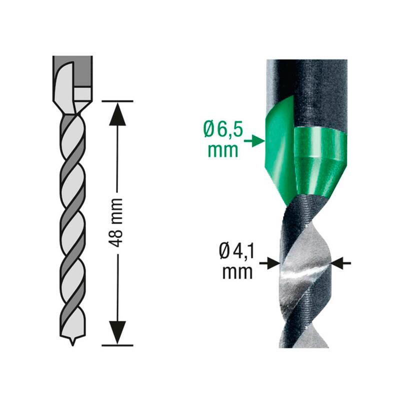 Der Bohrer hat eine Gesamtlänge von 48,0 mm und verfügt über zwei Stufen mit unterschiedlichen Durchmessern. Die erste Stufe hat einen Durchmesser von 4,1 mm, während die zweite Stufe einen Durchmesser von 6,5 mm aufweist. Dadurch können verschiedene Lochgrößen mit nur einem Werkzeug präzise und effizient bearbeitet werden. Die Werkzeugaufnahme erfolgt über ein Schnellspannbohrfutter, was einen schnellen und einfachen Wechsel des Bohrers ermöglicht.