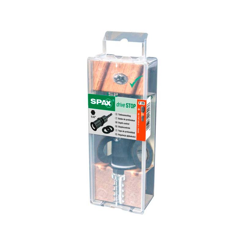 - Tiefenbegrenzer, bei dem sich die Einschraubtiefe der Schraube mittels eines Kontergewindes millimetergenau voreinstellen lässt. Der Filzring im Tiefenbegrenzer schützt die Oberfläche vor ungewünschten Abdrücken.