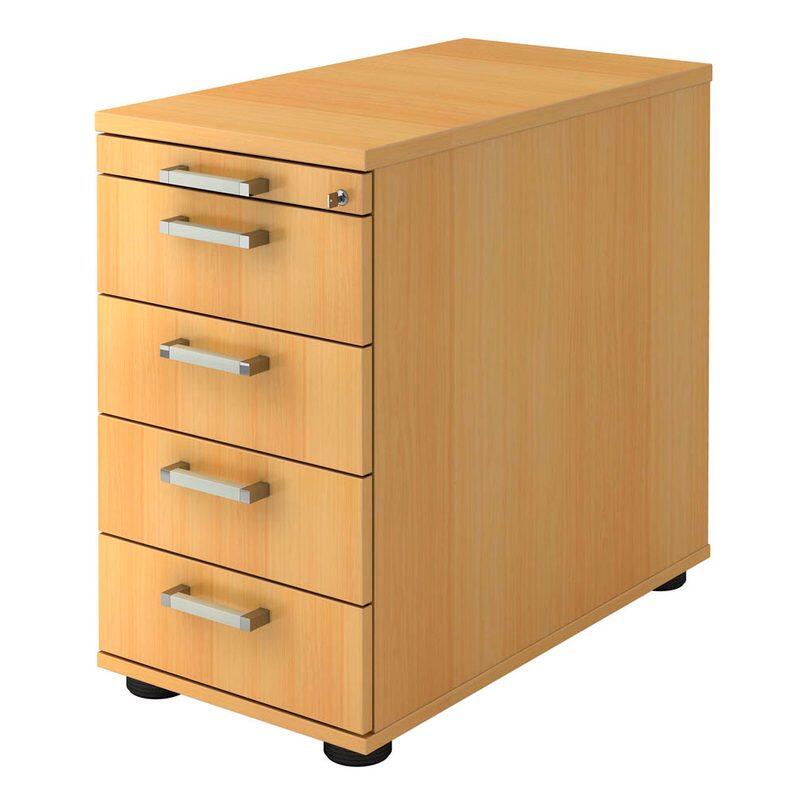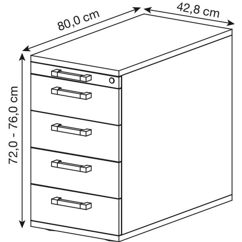 Der HAMMERBACHER Solid SC50 Standcontainer in buche ist die ideale Lösung für dein Büro oder Homeoffice, um Ordnung und Stil zu vereinen. Hergestellt aus hochwertiger Spanplatte, bietet dieser Standcontainer nicht nur eine ansprechende Optik, sondern auch eine hohe Stabilität und Langlebigkeit. Die elegante Farbgebung in buche fügt sich harmonisch in jede Büroumgebung ein und sorgt für eine angenehme Arbeitsatmosphäre. Mit seinen kompakten Maßen von 42,8 x 80,0 x 72,0 - 76,0 cm passt der Solid SC50 perfekt unter einen Schreibtisch oder kann als freistehendes Möbelstück genutzt werden. Er verfügt über fünf Auszüge, die dir ausreichend Stauraum für Unterlagen, Büromaterialien und persönliche Gegenstände bieten. Die Schubladen sind in der gleichen ansprechenden buche-Farbe gehalten und lassen sich dank der robusten Stangengriffe aus Metall mühelos öffnen und schließen. Die durchdachte Konstruktion und das funktionale Design machen diesen Standcontainer zu einem unverzichtbaren Begleiter im Büroalltag. Mit vier Fächern/Schüben hast du die Möglichkeit, deine Dokumente und Utensilien übersichtlich zu organisieren, sodass du jederzeit schnell auf das benötigte Material zugreifen kannst. Der HAMMERBACHER Solid SC50 Standcontainer ist nicht nur ein praktisches Möbelstück, sondern auch ein stilvolles Element, das deinem Arbeitsbereich einen modernen Touch verleiht. Egal ob im Homeoffice oder im professionellen Büro, dieser Standcontainer erfüllt höchste Ansprüche an Funktionalität und Design.Technische Daten