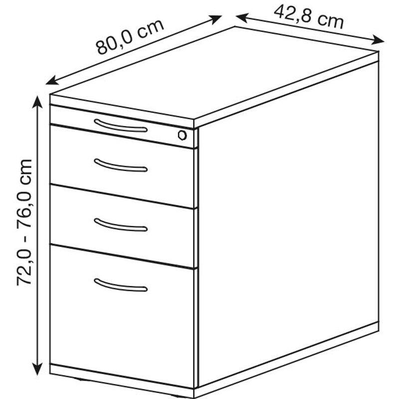 Der HAMMERBACHER Solid SC40 Standcontainer in elegantem Ahorn ist die perfekte Lösung für eine ordentliche und stilvolle Aufbewahrung in deinem Büro oder Arbeitsbereich. Mit seinen kompakten Maßen von 42,8 x 80,0 x 72,0 - 76,0 cm passt dieser Standcontainer problemlos unter jeden Schreibtisch und bietet gleichzeitig großzügigen Stauraum. Die Konstruktion aus hochwertiger Spanplatte sorgt für Stabilität und Langlebigkeit, während die ansprechende Ahornfarbe eine warme und einladende Atmosphäre schafft. Die Schubladen sind mit Teleskop-Metall-Kugelführungen ausgestattet, die einen sanften Selbsteinzug und einen Soft-Stopp bieten. Dies verhindert ein lautes Zuschlagen der Schubladen und ermöglicht ein leises und komfortables Schließen, was besonders in ruhigen Arbeitsumgebungen von Vorteil ist. Mit insgesamt vier Auszügen bietet der Standcontainer ausreichend Platz für deine Unterlagen, Büromaterialien oder persönliche Gegenstände. Die praktische Bügelgriff-Ausführung ermöglicht ein einfaches Öffnen und Schließen der Schubladen, sodass du jederzeit schnell auf deine Dinge zugreifen kannst. Die durchdachte Gestaltung und die Funktionalität des HAMMERBACHER Solid SC40 Standcontainers machen ihn zu einem unverzichtbaren Möbelstück für jeden Arbeitsplatz. Die Kombination aus modernem Design und praktischen Eigenschaften stellt sicher, dass du nicht nur Ordnung hältst, sondern auch stilvoll arbeitest. Dieser Standcontainer ist nicht nur ein praktischer Aufbewahrungsort, sondern auch ein elegantes Möbelstück, das deinem Büro eine besondere Note verleiht. Erlebe die Vorteile des HAMMERBACHER Solid SC40 und genieße einen aufgeräumten und inspirierenden Arbeitsplatz.Technische Daten