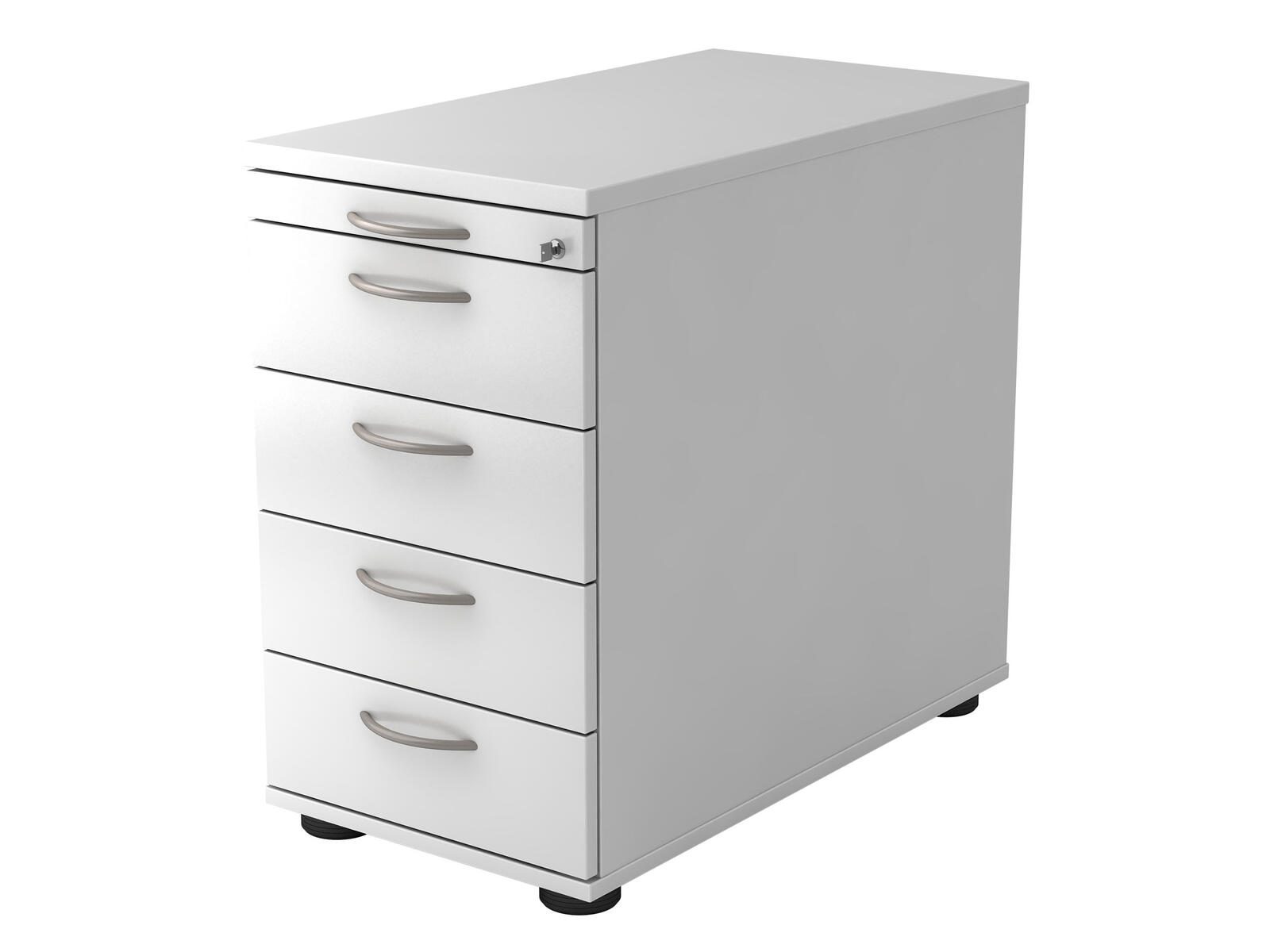 Der Standcontainer verfügt über insgesamt 4 geräumige Schubladen, die genügend Platz für deine Unterlagen, Büromaterialien oder persönlichen Gegenstände bieten. Die Schubladen sind ebenfalls in Weiß gehalten und passen perfekt zum Gesamtbild des Containers.