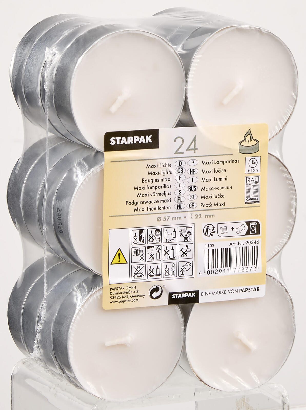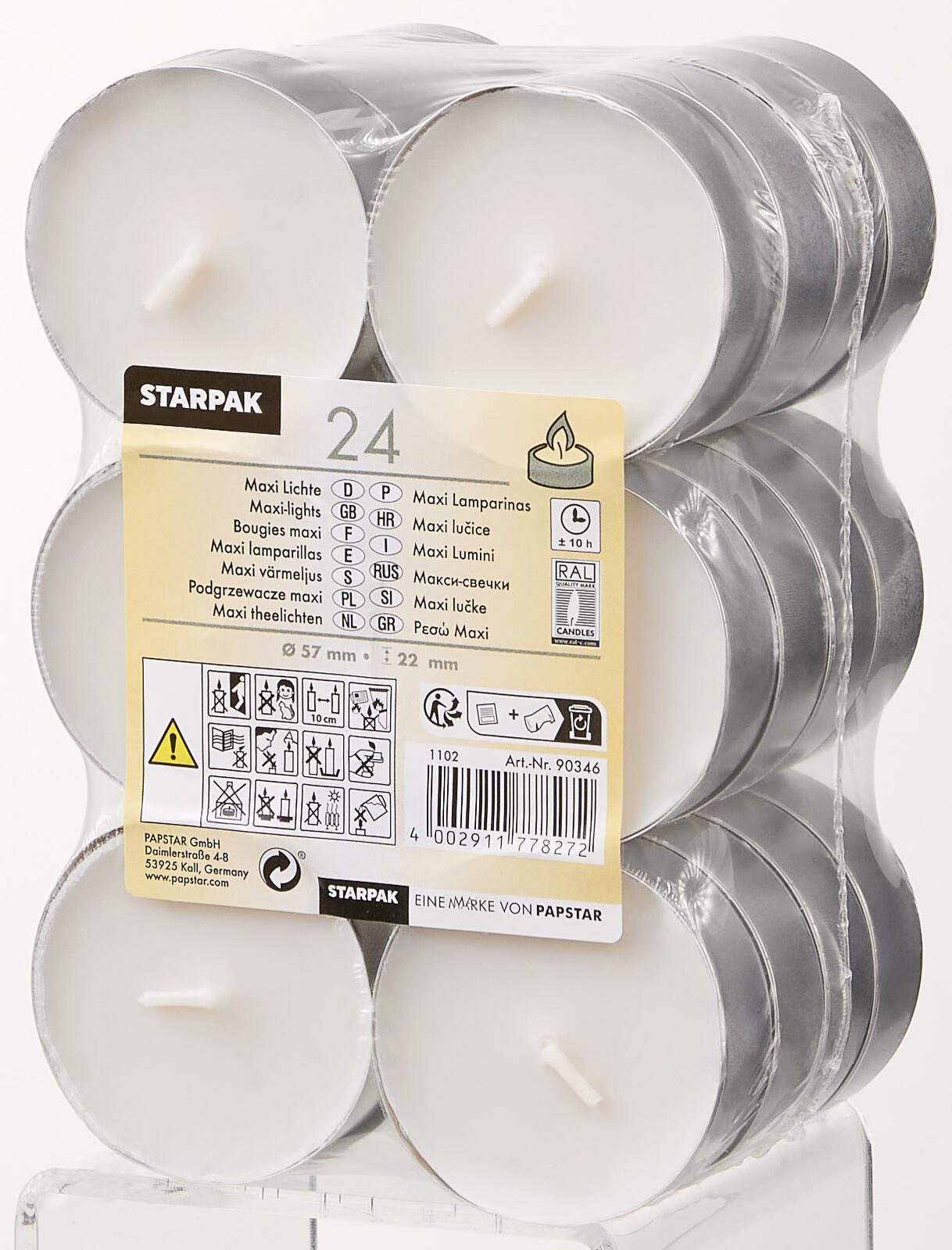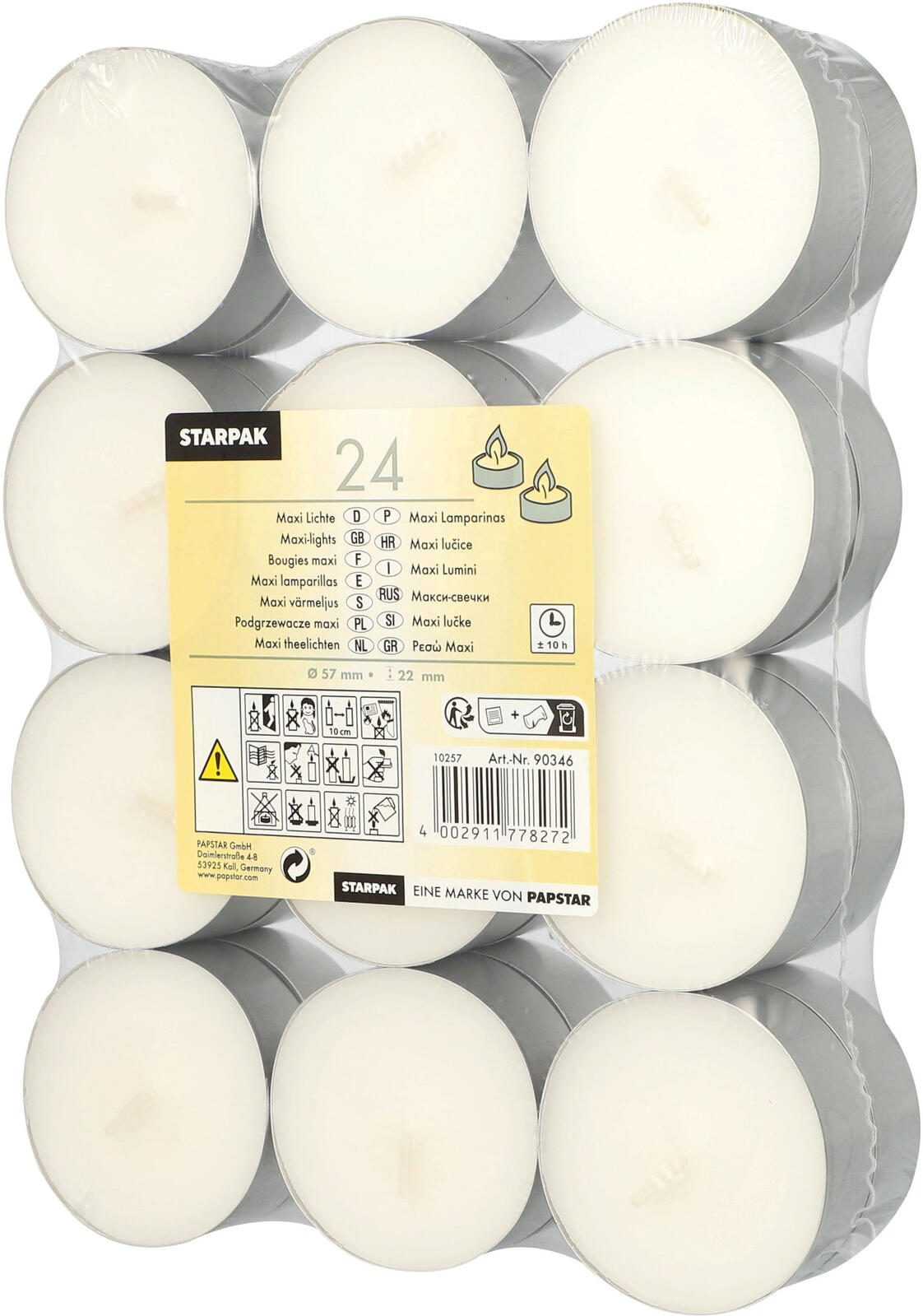 Die PAPSTAR Teelichter mit einem Durchmesser von 5.7 cm und einer Höhe von 2.2 cm sind die perfekte Ergänzung für jede festliche oder entspannende Atmosphäre. Diese eleganten Teelichter in einem strahlenden Weiß verleihen deinem Raum eine angenehme Lichtstimmung und schaffen eine einladende Umgebung. Jedes Teelicht wird aus hochwertigem Paraffin und Palmstearin gefertigt, was für eine saubere und gleichmäßige Brenndauer sorgt. Mit einem praktischen Packungsinhalt von 24 Stück bist du bestens ausgestattet, um zahlreiche Anlässe zu dekorieren. Ob für romantische Dinner, gemütliche Abende oder festliche Feiern, die PAPSTAR Teelichter setzen stimmungsvolle Akzente. Die weiße Farbe fügt sich harmonisch in jedes Dekor ein und lässt sich vielseitig kombinieren – sei es in deinem Wohnzimmer, auf dem Esstisch oder bei besonderen Veranstaltungen. Die Herstellerbezeichnung "Papstar 24 MaxiTeelicht" garantiert dir zudem eine hohe Qualität und Zuverlässigkeit. Diese Teelichter sind nicht nur dekorativ, sondern auch praktisch, da sie einfach zu handhaben sind und in verschiedenen Haltern verwendet werden können. Lass das sanfte Licht der PAPSTAR Teelichter dein Zuhause erhellen und genieße die entspannende Atmosphäre, die sie verbreiten.Technische Daten