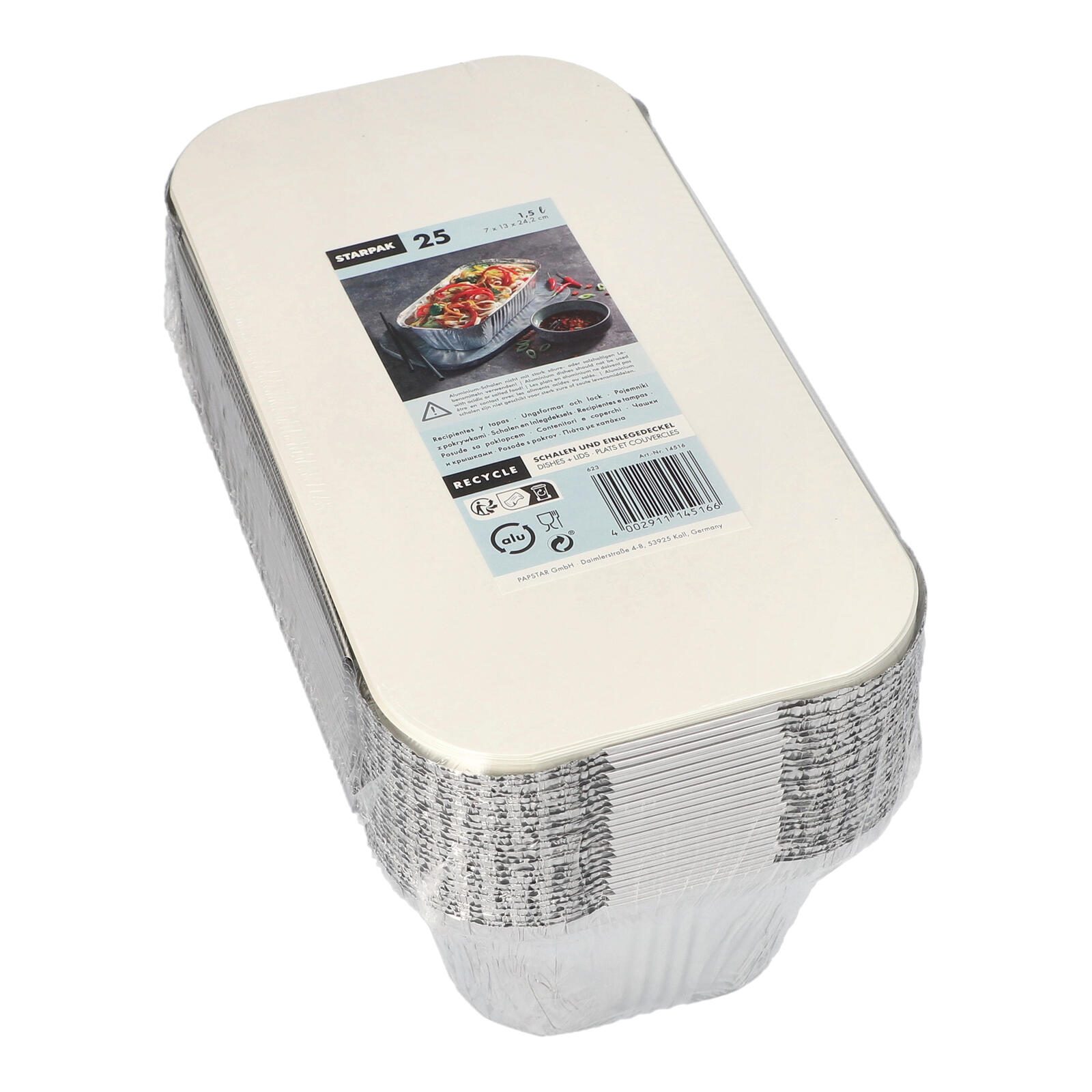 Die STARPAK Aluschalen mit Deckel in ansprechendem Silber sind die ideale Lösung für alle, die eine praktische und vielseitige Aufbewahrungslösung suchen. Mit einem großzügigen Fassungsvermögen von 1500 ml bieten diese Aluschalen ausreichend Platz für eine Vielzahl von Lebensmitteln. Egal, ob du leckere Aufläufe, Salate oder Snacks zubereitest, diese Schalen sind perfekt geeignet, um deine Kreationen frisch zu halten und ansprechend zu präsentieren. Hergestellt aus hochwertigem Aluminium, zeichnen sich die STARPAK Aluschalen durch ihre Stabilität und Langlebigkeit aus. Das Material sorgt dafür, dass die Schalen auch bei hohen Temperaturen sicher verwendet werden können, was sie ideal für den Einsatz im Ofen oder Grill macht. Dank des praktischen Deckels kannst du deine Speisen sicher abdecken und sie vor Verunreinigungen schützen. Dies ist besonders nützlich für Picknicks oder Grillpartys, bei denen du deine Gerichte transportieren möchtest. Die schlichte silberne Farbe verleiht den Aluschalen eine elegante Note, die sich in jede Tischdekoration einfügt. Mit einer Packung von 25 Stück bist du bestens ausgestattet, um für jede Gelegenheit gerüstet zu sein. Ob für den täglichen Gebrauch oder besondere Anlässe, die STARPAK Aluschalen sind eine praktische Wahl, die dir viel Zeit und Mühe beim Kochen und Servieren erspart. Dank ihrer Vielseitigkeit und Benutzerfreundlichkeit sind diese Aluschalen nicht nur für den Heimgebrauch geeignet, sondern auch für Gastronomiebetriebe, Catering-Dienste oder Veranstaltungen. Die STARPAK Aluschalen mit Deckel sind die perfekte Kombination aus Funktionalität und Stil, die dir hilft, deine kulinarischen Kreationen optimal zur Geltung zu bringen.Technische Daten