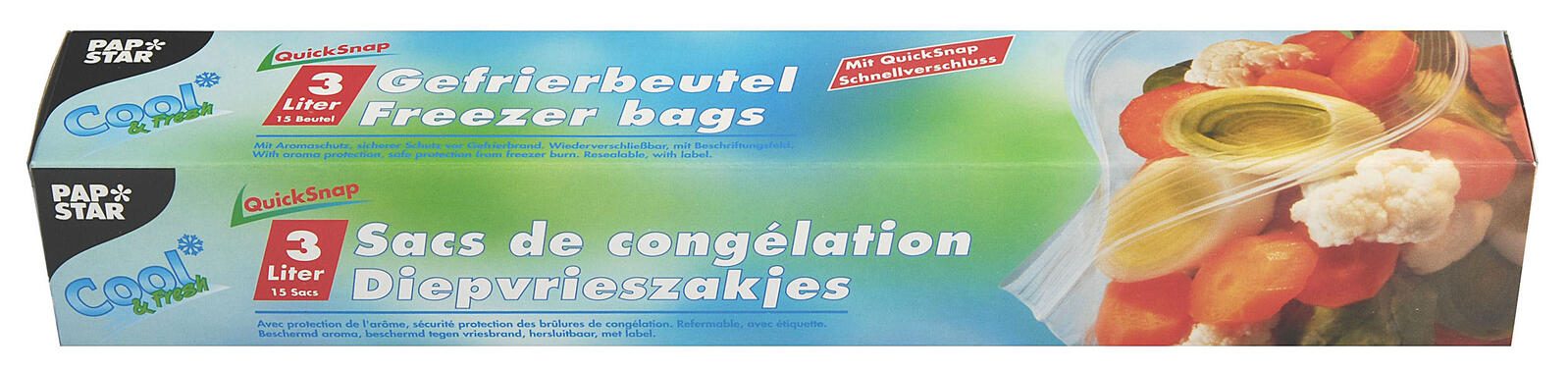 Die PAPSTAR Gefrierbeutel aus hochwertigem Polyethylen (PE) bieten eine praktische Lösung zur Aufbewahrung von Lebensmitteln im Gefrierfach. Mit einem Fassungsvermögen von 3,0 Litern und den Maßen von 27,0 x 28,0 cm sind sie ideal für die Lagerung von größeren Mengen an Lebensmitteln, sei es für die Vorbereitung von Mahlzeiten oder die Aufbewahrung von Resten. Die robuste Stärke von 55 Mikron sorgt dafür, dass die Beutel auch bei niedrigen Temperaturen zuverlässig sind und deine Lebensmittel vor Gefrierbrand schützen. Der praktische Druckverschluss ermöglicht ein einfaches und sicheres Verschließen, sodass du dir keine Sorgen um das Auslaufen oder das Eindringen von Luft machen musst. Dies trägt nicht nur zur Frische deiner Lebensmittel bei, sondern hilft auch, unangenehme Gerüche im Gefrierfach zu vermeiden. Jede Verpackungseinheit enthält 15 Stück, was dir eine kosteneffiziente Möglichkeit bietet, deine Lebensmittel über einen längeren Zeitraum hinweg zu lagern. Die transparenten Beutel ermöglichen es dir, den Inhalt jederzeit auf einen Blick zu erkennen, ohne sie öffnen zu müssen. Die PAPSTAR QuickSnap Gefrierbeutel sind nicht nur funktional, sondern auch umweltfreundlich, da sie aus recycelbarem Material bestehen. Mit diesen Gefrierbeuteln triffst du eine ausgezeichnete Wahl für eine nachhaltige und ordentliche Lagerung deiner Lebensmittel. Ob für die Aufbewahrung von Obst, Gemüse, Fleisch oder Fertiggerichten – die PAPSTAR Gefrierbeutel sind vielseitig einsetzbar und eine wertvolle Ergänzung für jede Küche.Technische Daten