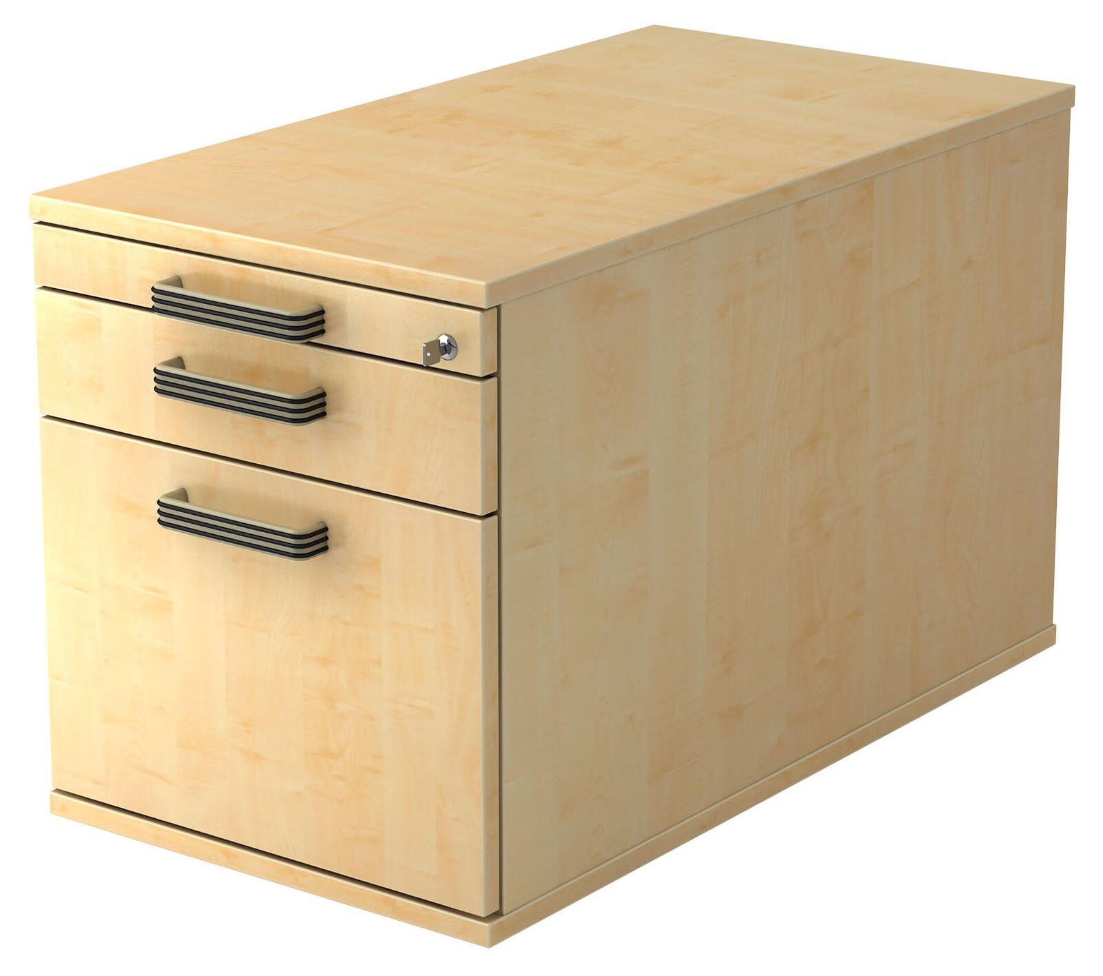 Der HAMMERBACHER Rollcontainer VTC20/3/3/SG in ansprechendem Ahornlook ist die perfekte Ergänzung für dein Büro oder Homeoffice. Mit seiner kompakten Größe von 42,8 x 80,0 x 51,2 cm bietet er ausreichend Stauraum, ohne dabei viel Platz in Anspruch zu nehmen. Der Rollcontainer ist aus hochwertiger Spanplatte gefertigt, was ihn sowohl robust als auch leicht macht. Die Ausführung mit Selbsteinzug und Soft-Stopp sorgt dafür, dass die Schubladen sanft und leise schließen. Dies ist besonders vorteilhaft, um eine ruhige Arbeitsumgebung zu schaffen. Die drei Schubladen bieten dir die Möglichkeit, Dokumente, Büromaterialien und persönliche Gegenstände ordentlich zu verstauen, während der Relinggriff aus Kunststoff ein komfortables Öffnen und Schließen ermöglicht. Die elegante Farbgebung in Ahorn verleiht dem Rollcontainer ein modernes und freundliches Erscheinungsbild, das sich harmonisch in verschiedene Einrichtungsstile einfügt. Die Serie TC20 steht für Funktionalität und zeitloses Design, was den HAMMERBACHER Rollcontainer zu einer idealen Wahl für alle macht, die Wert auf Qualität und Ästhetik legen. Mit diesem Rollcontainer erhältst du nicht nur einen praktischen Stauraum, sondern auch ein stilvolles Möbelstück, das deinen Arbeitsplatz aufwertet und für Ordnung sorgt. Der HAMMERBACHER Rollcontainer VTC20/3/3/SG ist die ideale Lösung für alle, die eine Kombination aus Funktionalität, Qualität und ansprechendem Design suchen.Technische Daten