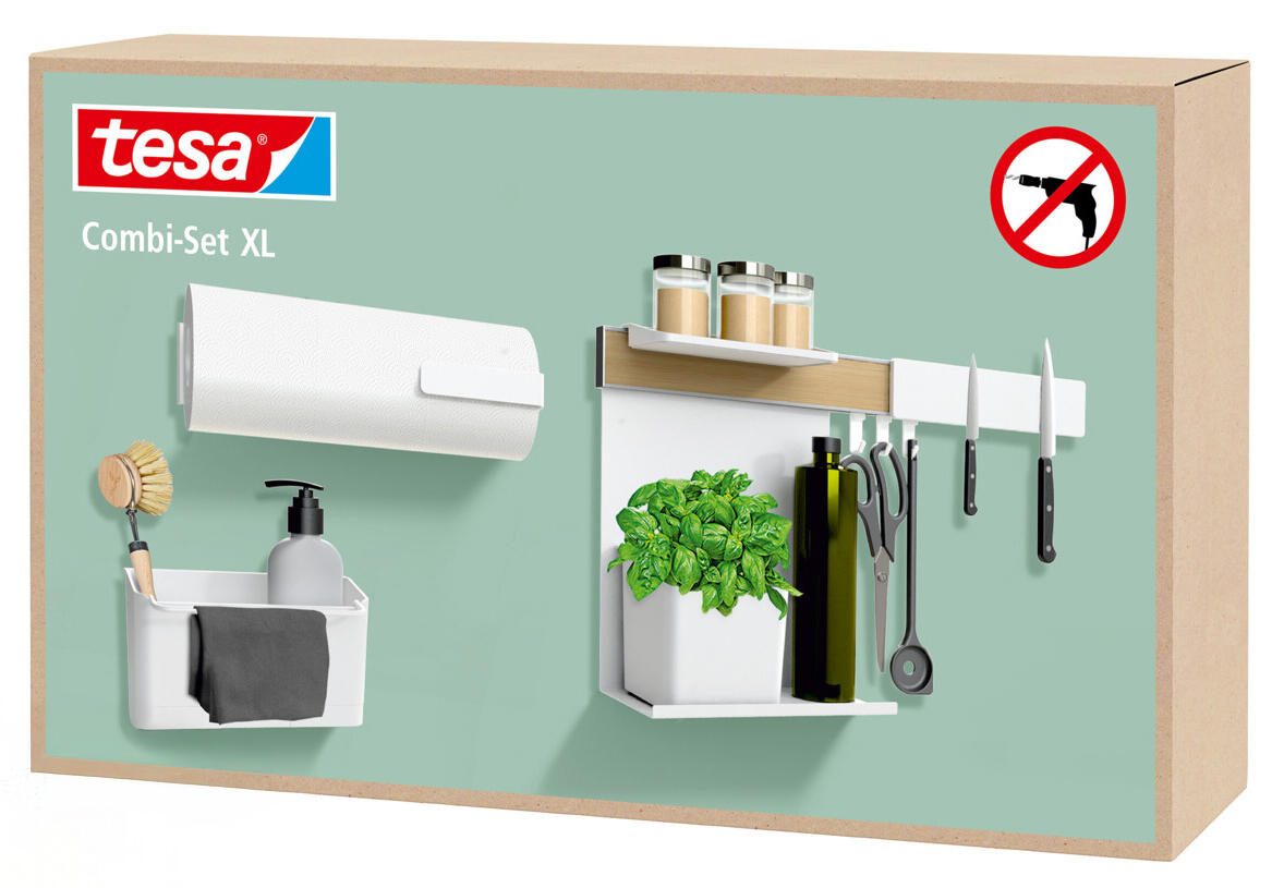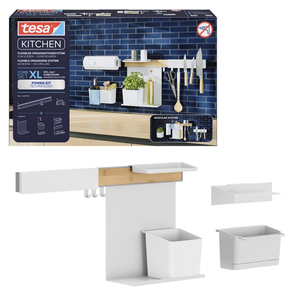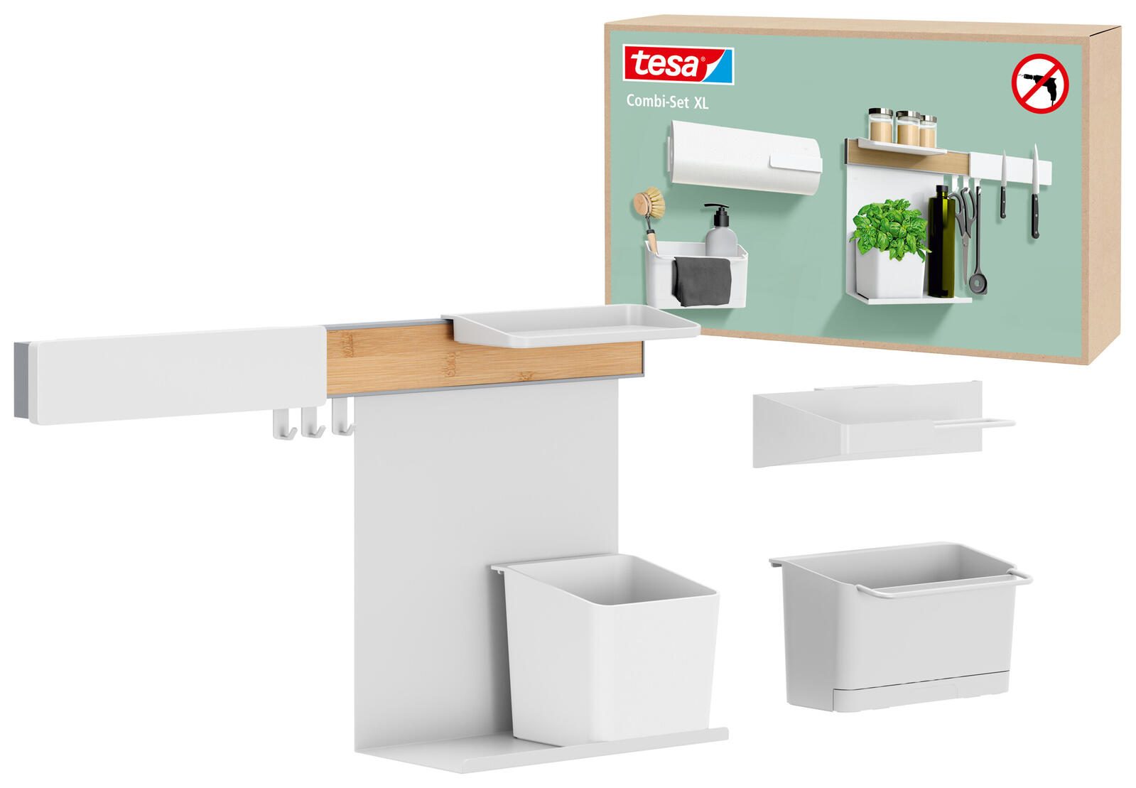Das Design des tesa Küchenorganizer Sets XL ist nicht nur funktional, sondern auch optisch ansprechend und fügt sich harmonisch in verschiedene Küchenstile ein. Die Kombination aus natürlichen Bambus-Elementen und dem weißen Farbton schafft eine freundliche und moderne Atmosphäre. Dieses Regalsystem aus der Serie Kombi Set XL unterstützt Sie dabei, Ihre Küche übersichtlich zu gestalten und den vorhandenen Platz optimal zu nutzen.