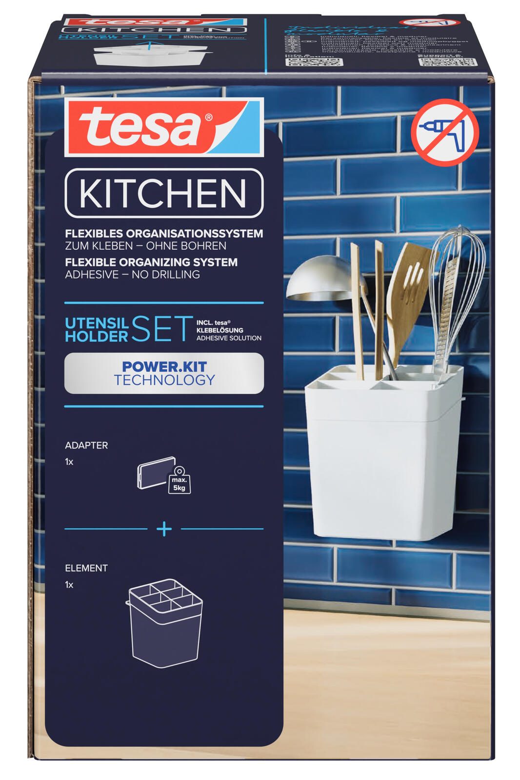 Die Montage gestaltet sich besonders einfach und benutzerfreundlich: Dank des tesa® Power.Kit Adapters und des mitgelieferten Klebeapplikators lässt sich der Utensilienhalter ohne Bohren oder zusätzliches Werkzeug sicher und stabil anbringen. Dabei ist das Set für eine Vielzahl von Oberflächen geeignet, darunter Fliesen, Glas, Metall, Naturstein, Beton, Holz sowie viele Kunststoffe. So können Sie den Halter flexibel an der für Sie idealen Stelle in der Küche befestigen.