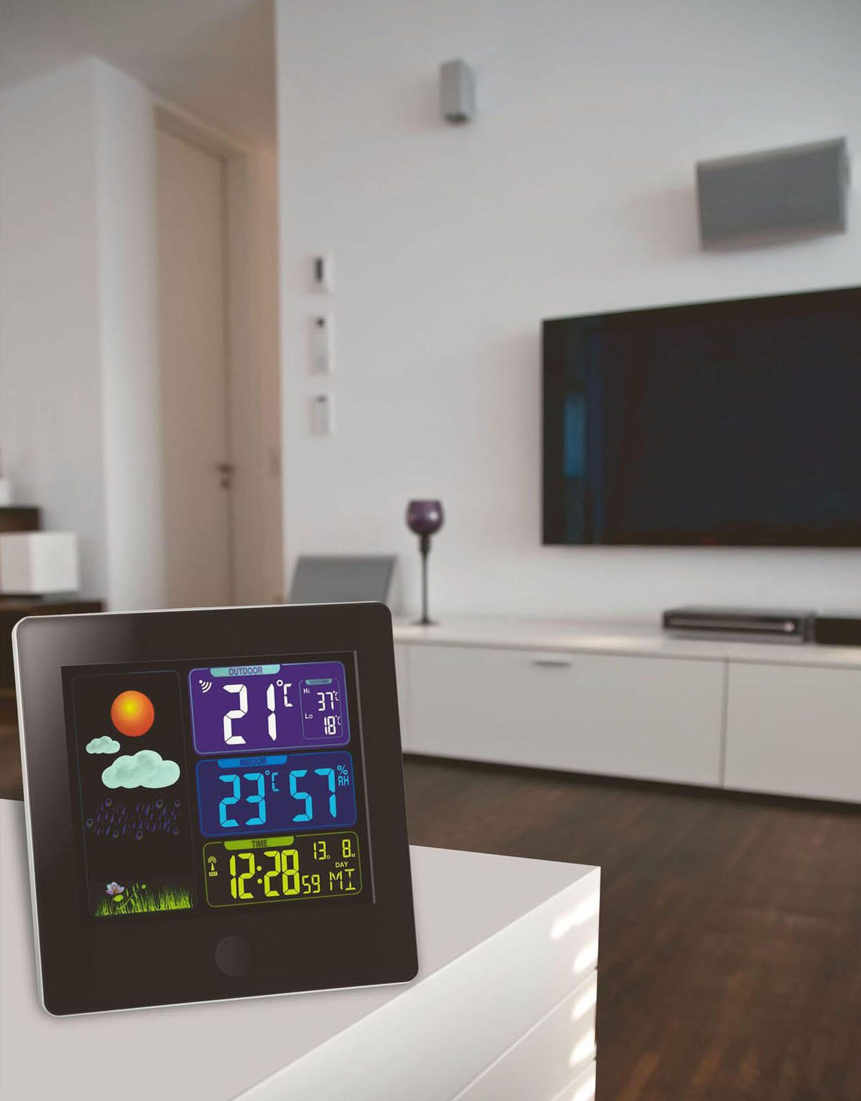 Die Wetterstation ist aus hochwertigem Kunststoff gefertigt und besticht durch ihre schlichte Eleganz. Der Farbton Schwarz verleiht ihr eine zeitlose und klassische Optik, die sich harmonisch in jedes Ambiente einfügt.