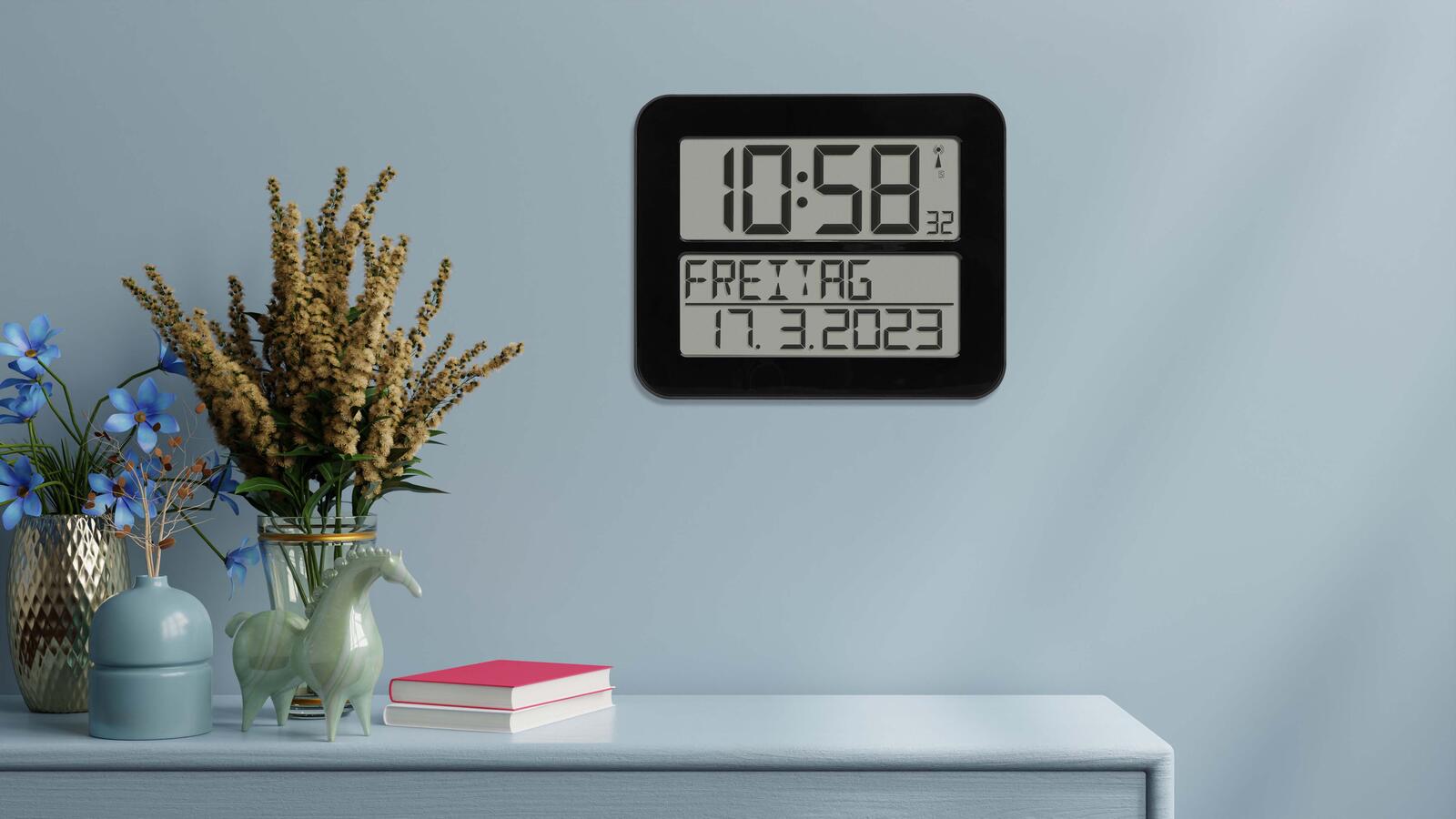- Eigenschaften: autom. Zeitumstellung, Wandmontage, lautlos, Kalender, Weckfunktion