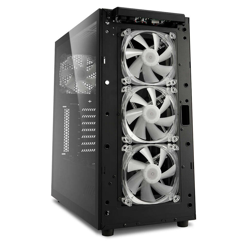 Effektive Kühlleistung. Damit das TG6M RGB auch im Dauerbetrieb nicht ins Schwitzen kommt, verfügt das Gehäuse über eine Vielzahl an Lüftungsoptionen. Das neue Mesh-Gitter gewährleistet einen optimalen Airflow. Unterstützt wird dieser von den drei hinter dem Mesh-Gitter angebrachten adressierbaren 120-mm-RGB-LED-Lüftern, die der Gehäusefront gleichzeitig ihren strahlenden Look verleihen. Das Seitenteil aus gehärtetem Glas bietet tiefe Einblicke in das Innere des Gehäuses und dient zugleich als Schaufenster für die darin verbaute Hardware. Der vierte 120-mm-RGB-LED-Lüfter auf der Gehäuserückseite leuchtet dabei die verbauten Komponenten eindrucksvoll aus.