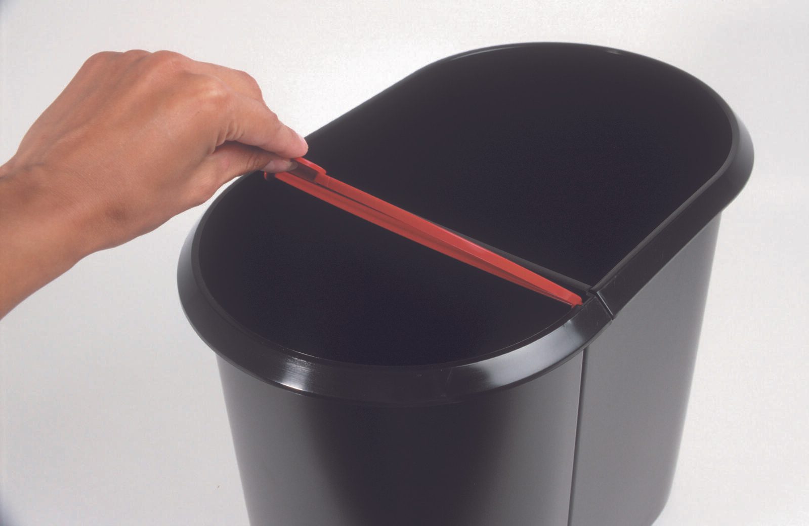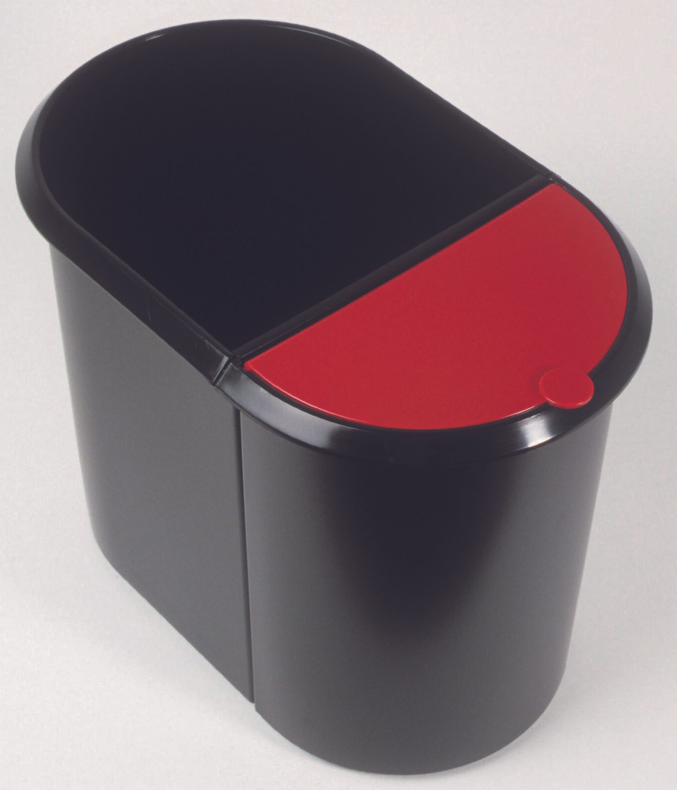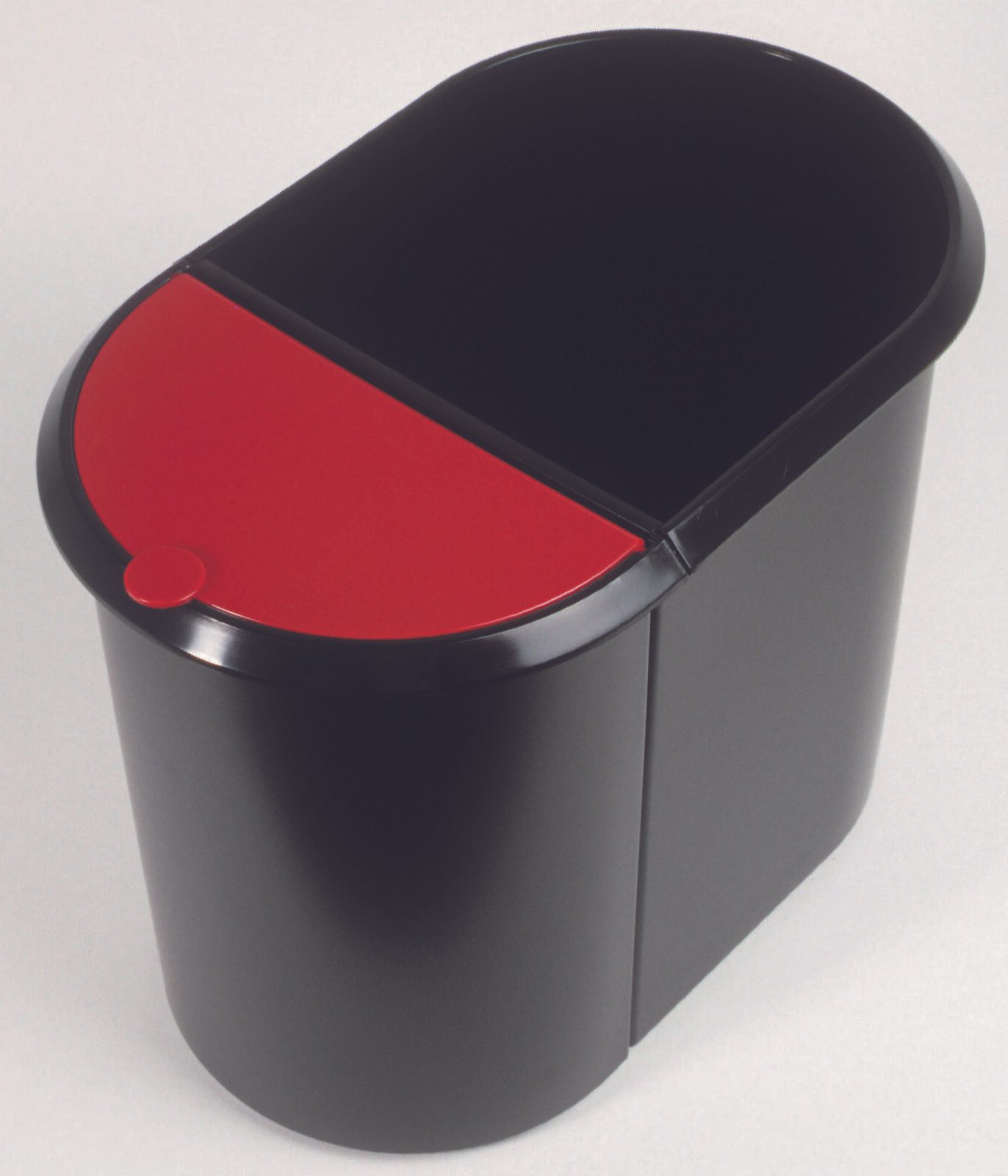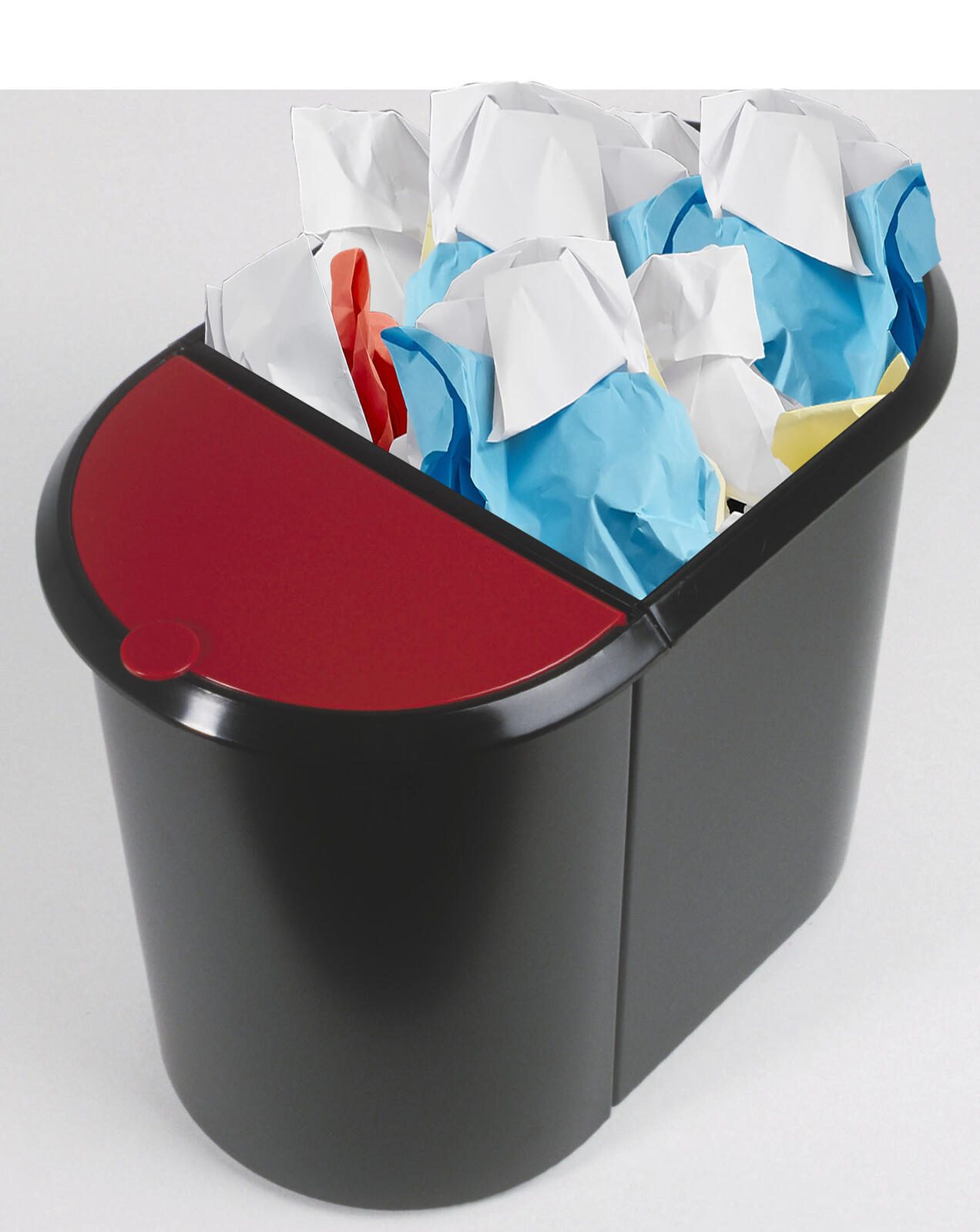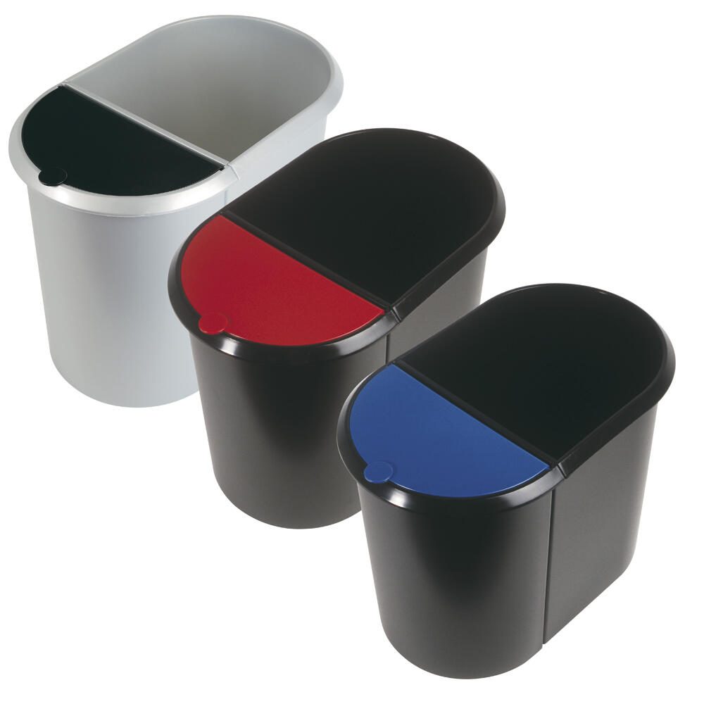 Der helit Mülltrenner 20,0 + 9,0 l in elegantem Schwarz vereint Funktionalität mit ansprechendem Design und ist die ideale Lösung für eine umweltbewusste Abfalltrennung im Innenbereich. Mit einem großzügigen Fassungsvermögen von 20 Litern für Papier und 9 Litern für nasse und sonstige Abfälle bietet dieser Mülltrenner ausreichend Platz für deine alltäglichen Abfälle. Die durchdachte Ausführung mit umlaufendem Griffrand ermöglicht ein einfaches Handling und eine komfortable Entleerung. Der integrierte Tretmechanismus sorgt dafür, dass du den Deckel hygienisch öffnen kannst, ohne ihn mit den Händen berühren zu müssen. Der Klappdeckel aus hochwertigem Polystyrol garantiert eine einfache Handhabung und schützt den Inhalt vor unangenehmen Gerüchen. Das Material des Mülltrenners ist robust und langlebig, was ihn zu einem idealen Begleiter für den Innenbereich macht. Die Kombination aus Kunststoff und dem ansprechenden Farbton Schwarz verleiht dem Produkt nicht nur eine moderne Optik, sondern sorgt auch dafür, dass es sich harmonisch in jede Raumgestaltung einfügt. Der rote Deckel setzt zudem einen attraktiven Farbakzent und erleichtert die Zuordnung der Abfallarten. Mit Abmessungen von 44,5 x 28,0 cm nimmt der helit Mülltrenner nicht zu viel Platz ein und passt perfekt in Küchen, Büros oder andere Innenräume. Die durchdachte Konstruktion und das ansprechende Design machen diesen Mülltrenner zu einer praktischen und stilvollen Wahl für jeden Haushalt oder Arbeitsplatz, der Wert auf Ordnung und Umweltschutz legt.Technische Daten