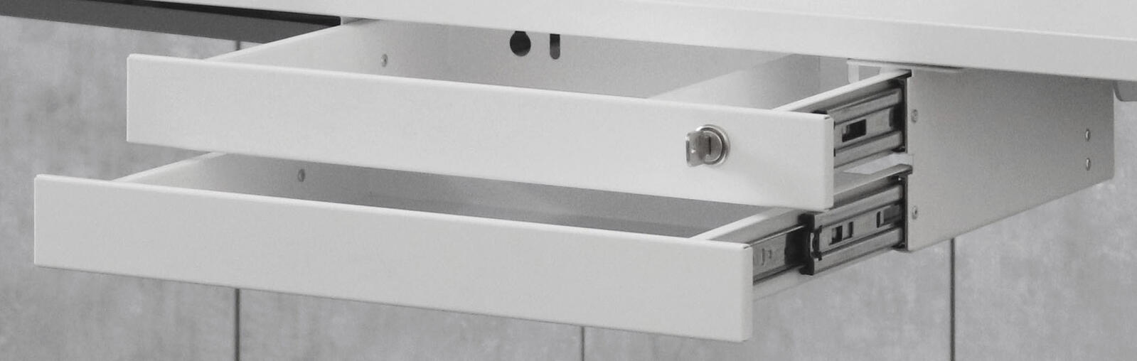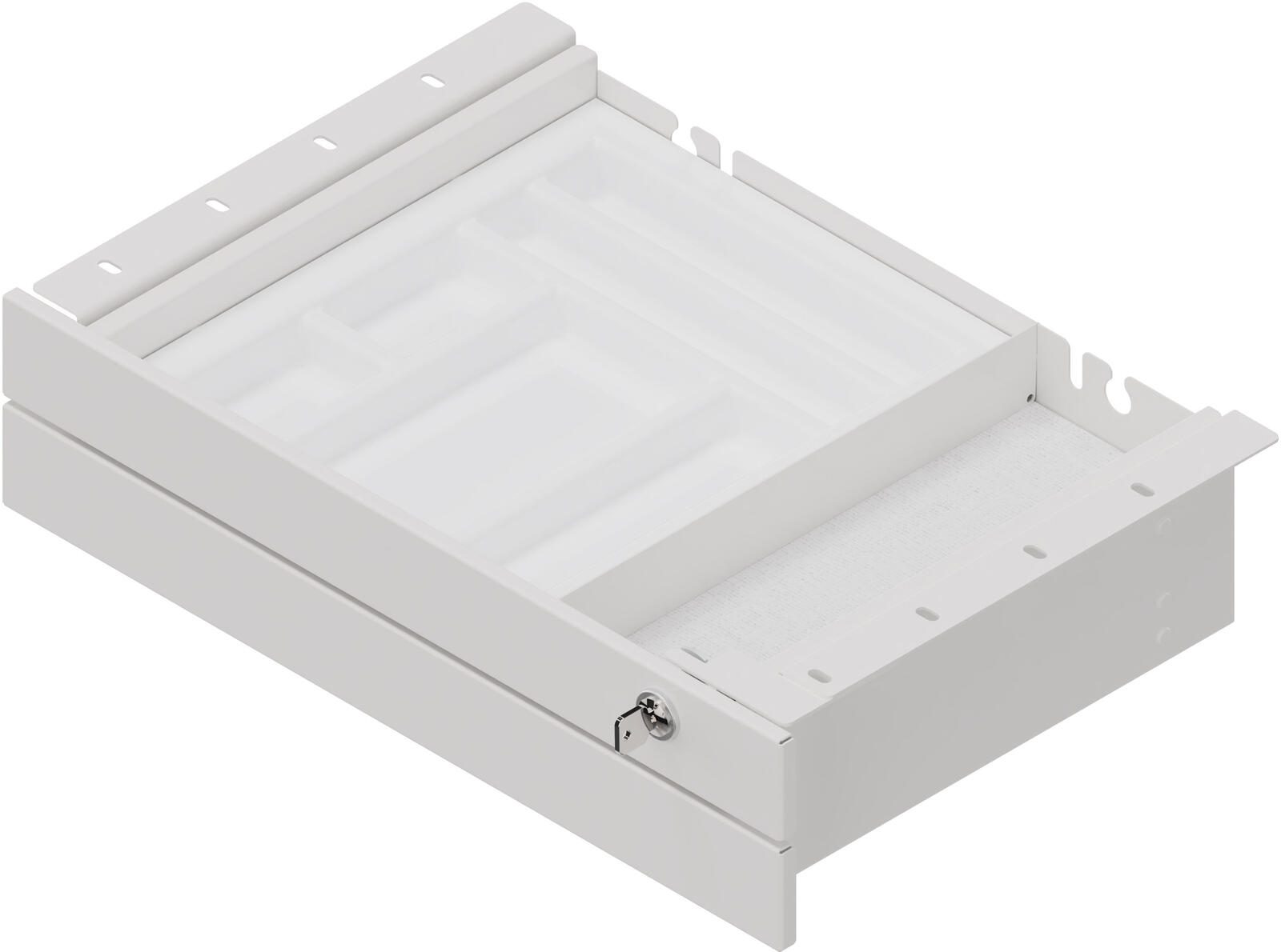 Dank ihres weißen Farbtons fügt sich die Schublade harmonisch in jedes Bürodesign ein. Die UCT2/W Serie von HAMMERBACHER steht für Qualität und Funktionalität. Diese Schublade ist geeignet für rechteckige Schreibtische mit einer Plattendicke ab 2,5 cm (erforderliche Tiefe 31,5 cm ab Tischplattenvorderkante).