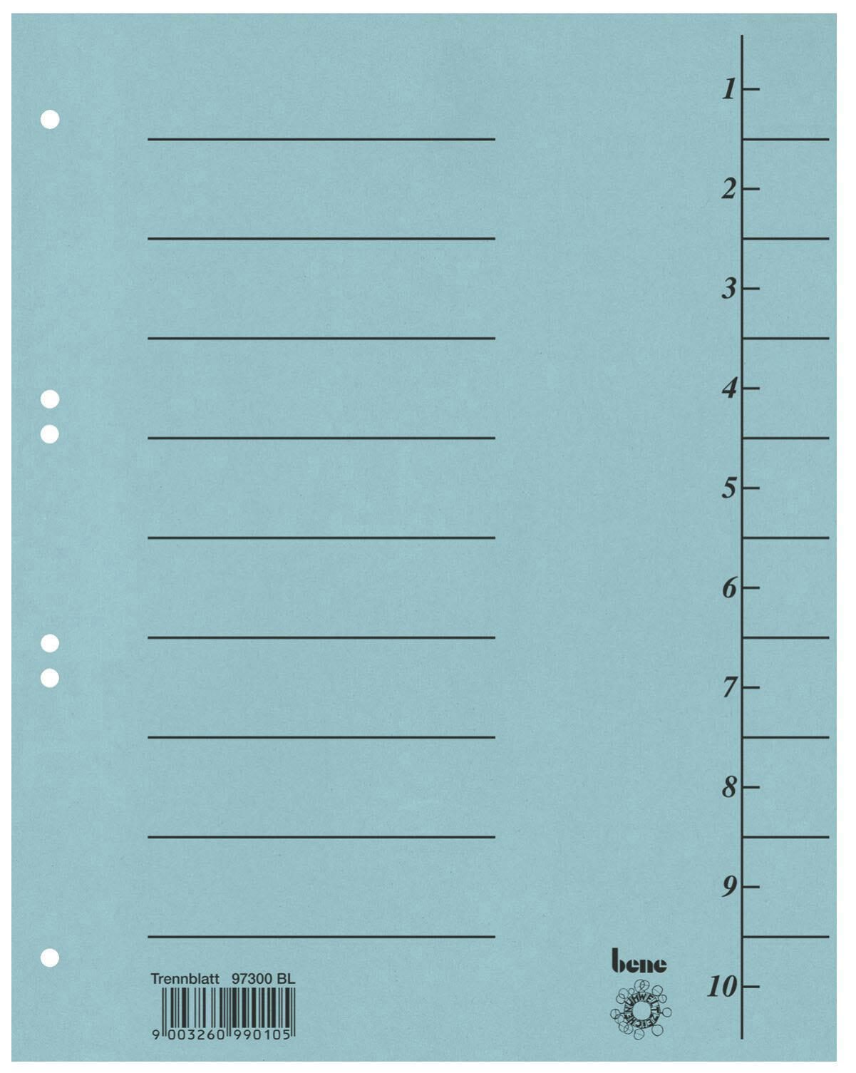 Die bene Trennblätter DIN A4 in einem ansprechenden Blau sind die ideale Lösung, um deine Unterlagen übersichtlich zu strukturieren und gleichzeitig einen professionellen Eindruck zu hinterlassen. Hergestellt aus hochwertigem Kraftkarton, bieten diese Trennblätter eine hervorragende Stabilität und Langlebigkeit, die du bei der Organisation deiner Dokumente benötigst. Mit einem Papiergewicht von 250 g/m² sind sie besonders robust und widerstandsfähig, sodass sie auch bei häufigem Blättern nicht so leicht beschädigt werden. Die Trennblätter sind speziell für das DIN A4 Format konzipiert und verfügen über eine praktische 6-fach-Lochung, die eine einfache Ablage in Ordnern ermöglicht. Du kannst die Blätter problemlos nutzen, um deine Unterlagen nach verschiedenen Themen oder Projekten zu sortieren. Die Taben sind von 1 bis 10 nummeriert und bieten somit eine klare und intuitive Navigation durch deine Dokumente. Ein weiteres Highlight dieser Trennblätter ist die ausschneidbare Tabenart, die dir die Flexibilität gibt, die Taben nach deinen individuellen Bedürfnissen zu gestalten. Dies ist besonders nützlich, wenn du spezifische Bezeichnungen oder Kategorien für deine Unterlagen benötigst. Die Trennblätter sind zudem holzfrei und tragen somit zu einem umweltfreundlichen Umgang mit Ressourcen bei. Mit einer Packung von 100 Stück hast du ausreichend Material zur Hand, um deine gesamte Dokumentation zu organisieren. Der kräftige Blauton sorgt nicht nur für eine ansprechende Optik, sondern hilft auch dabei, wichtige Informationen schnell zu finden. Die bene Trennblätter sind die perfekte Wahl für alle, die Wert auf Qualität und Funktionalität legen.Technische Daten