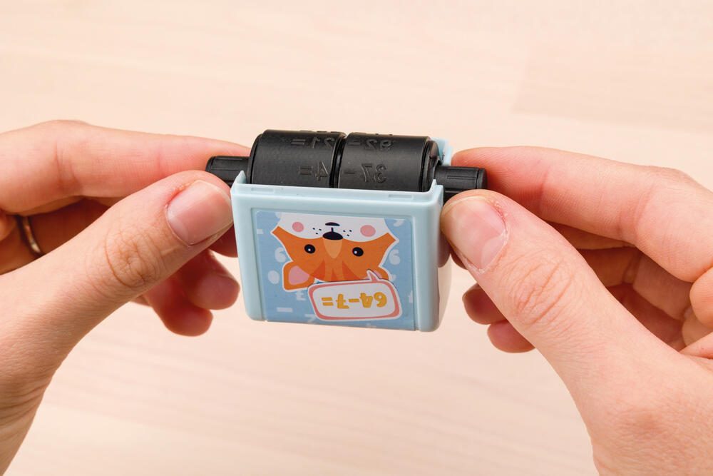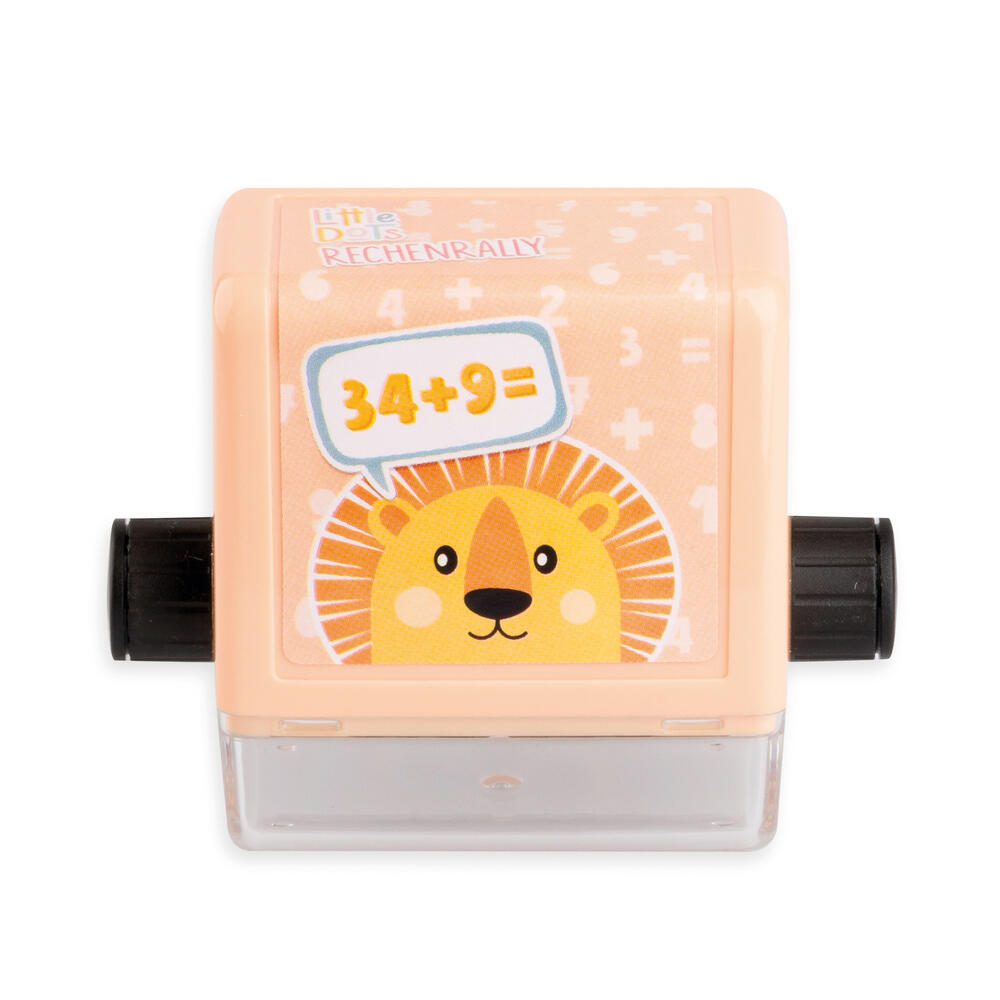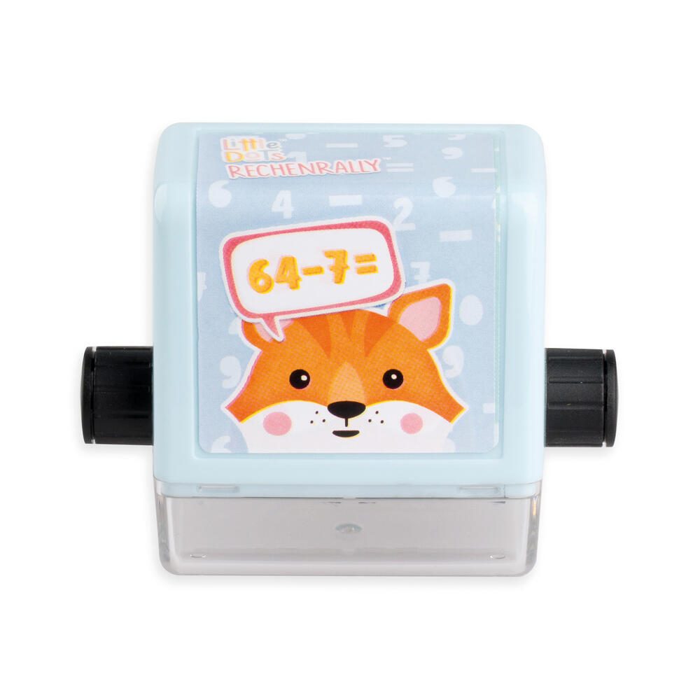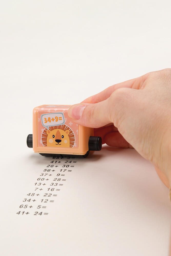 Das Set zeichnet sich durch eine drehbare Textplatte aus, die das schnelle Wechseln zwischen Plus- und Minusrechenaufgaben ermöglicht. Das integrierte Stempelkissen sorgt dafür, dass der Stempel sofort einsatzbereit ist und keine zusätzlichen Materialien benötigt werden. Die Farbgestaltung in Blau und Beige verleiht dem Rollstempel ein ansprechendes und zugleich funktionales Design.