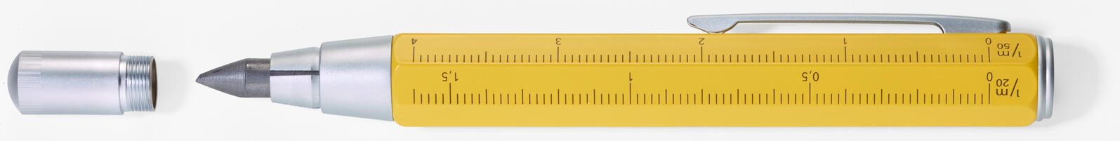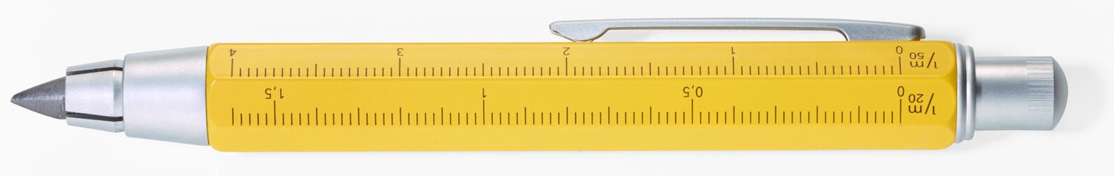 Der Bleistift besitzt eine sechskantige Form, die ein angenehmes und sicheres Halten ermöglicht. Die gelbe Schaftfarbe sorgt für eine gute Sichtbarkeit auf der Baustelle. Die Mine hat den Härtegrad HB, was eine ausgewogene Balance zwischen Härte und Schreibkomfort bietet. Ein Radierer ist nicht vorhanden, da der Fokus auf dem professionellen Anreißen und Markieren liegt.