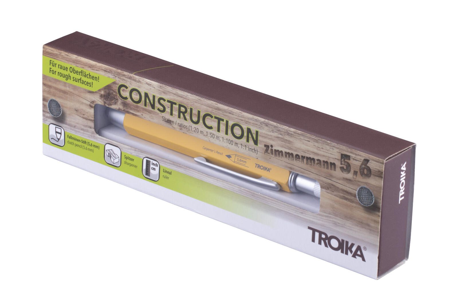 Der TROIKA® Bleistift ZIMMERMANN 5,6 ist ein speziell entwickelter Zimmermannsbleistift, der sich besonders für Handwerker wie Zimmerleute, Maurer sowie Beton- und Stahlbetonbauer eignet. Er ist ideal zum Skizzieren und Anreißen auf rauen Oberflächen wie Holz, Stein und Beton. Durch seine robuste Konstruktion und die praktische Form unterstützt er präzises Arbeiten in anspruchsvollen Umgebungen.