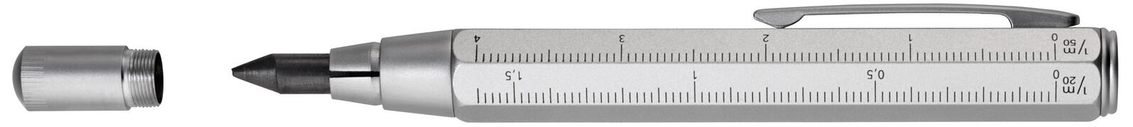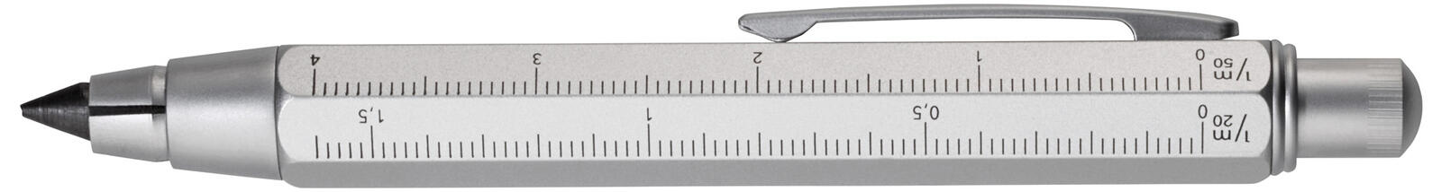 Der Bleistift besitzt eine sechskantige Form, die ein angenehmes und sicheres Halten gewährleistet. Die silberfarbene Schaftfarbe verleiht ihm ein schlichtes und funktionales Erscheinungsbild. Der Härtegrad der Mine ist HB, was eine ausgewogene Balance zwischen Härte und Schwärze bietet und somit vielseitig einsetzbar ist. Ein Radierer ist nicht vorhanden, was die typische Nutzung als Anreiß- und Markierwerkzeug unterstreicht.